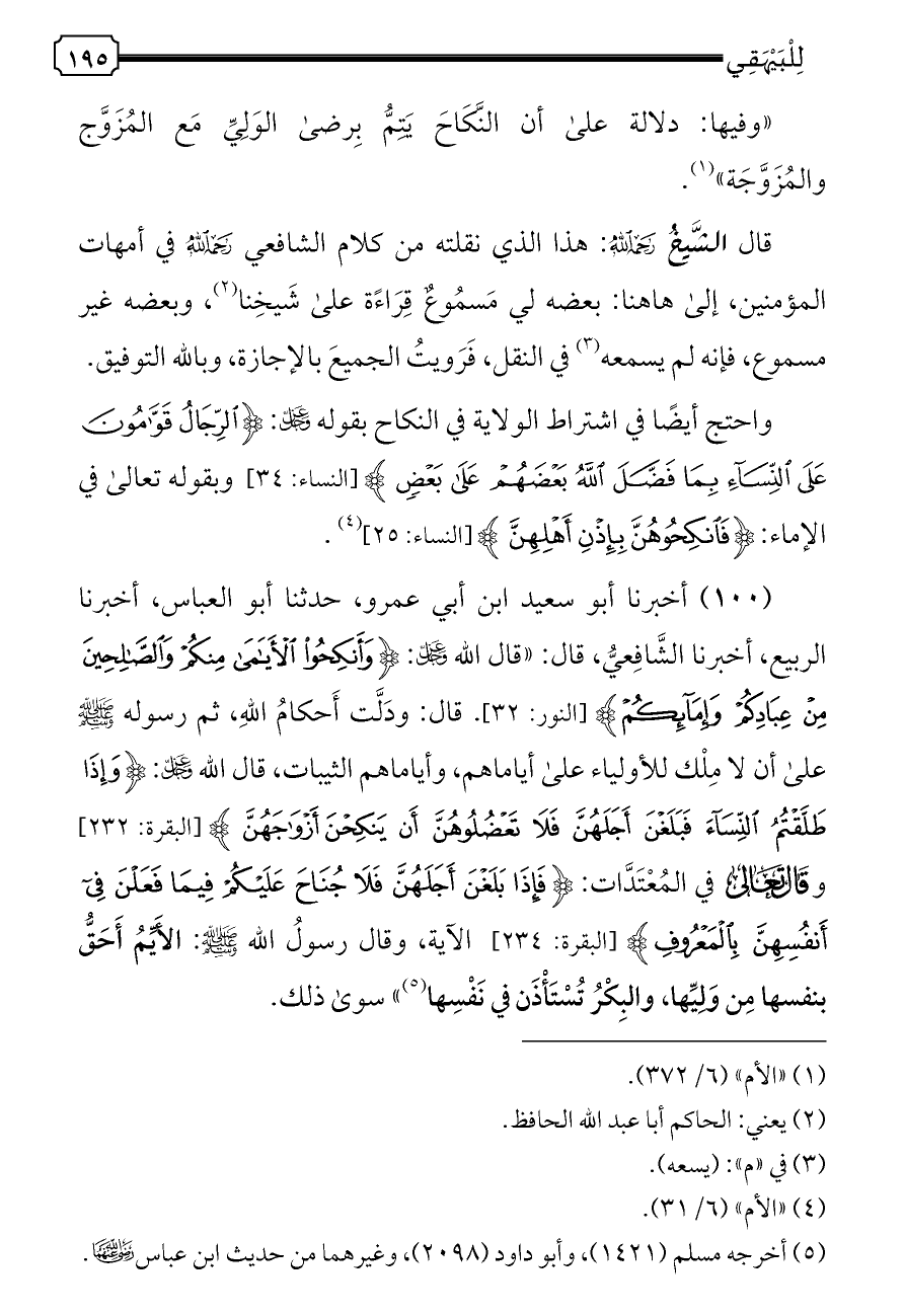 (١٠٠) أخبرنا أبو سعيد ابن أبي عمرو، حدثنا أبو العباس، أخبرنا الربيع، أخبرنا الشَّافِعيُّ، قال: «قال الله - عز وجل -: {وَأَنْكِحُوا الْأَيَامَى مِنْكُمْ وَالصَّالِحِينَ مِنْ عِبَادِكُمْ وَإِمَائِكُمْ} [النور: ٣٢]. قال: ودَلَّت أَحكامُ اللهِ، ثم رسوله - صلى الله عليه وسلم - على أن لا مِلْك للأولياء على أياماهم، وأياماهم الثيبات، قال الله - عز وجل -: {وَإِذَا طَلَّقْتُمُ النِّسَاءَ فَبَلَغْنَ أَجَلَهُنَّ فَلَا تَعْضُلُوهُنَّ أَنْ يَنْكِحْنَ أَزْوَاجَهُنَّ} [البقرة: ٢٣٢] وقال تعالى في المُعْتَدَّات: {فَإِذَا بَلَغْنَ أَجَلَهُنَّ فَلَا جُنَاحَ عَلَيْكُمْ فِيمَا فَعَلْنَ فِي أَنْفُسِهِنَّ بِالْمَعْرُوفِ} [البقرة: ٢٣٤] الآية، وقال رسولُ الله - صلى الله عليه وسلم -: الأَيِّمُ أَحَقُّ بنفسها مِن وَلِيِّها، والبِكْرُ تُسْتَأْذَن في نَفْسِها (¬٥)» سوى ذلك.