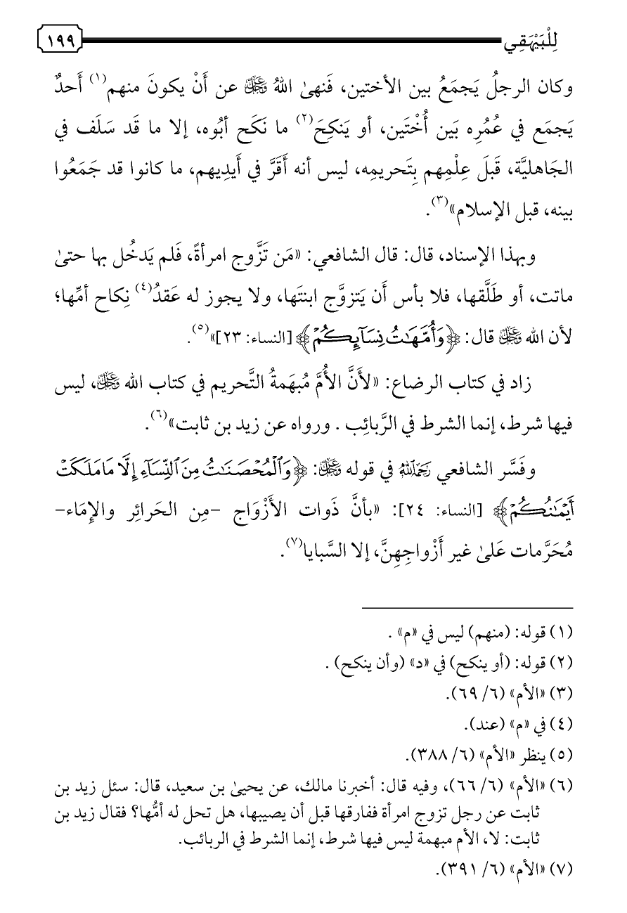 (¬٦) «الأم» (٦/ ٦٦)، وفيه قال: أخبرنا مالك، عن يحيى بن سعيد، قال: سئل زيد بن ثابت عن رجل تزوج امرأة ففارقها قبل أن يصيبها، هل تحل له أمُّها؟ فقال زيد بن ثابت: لا، الأم مبهمة ليس فيها شرط، إنما الشرط في الربائب.
