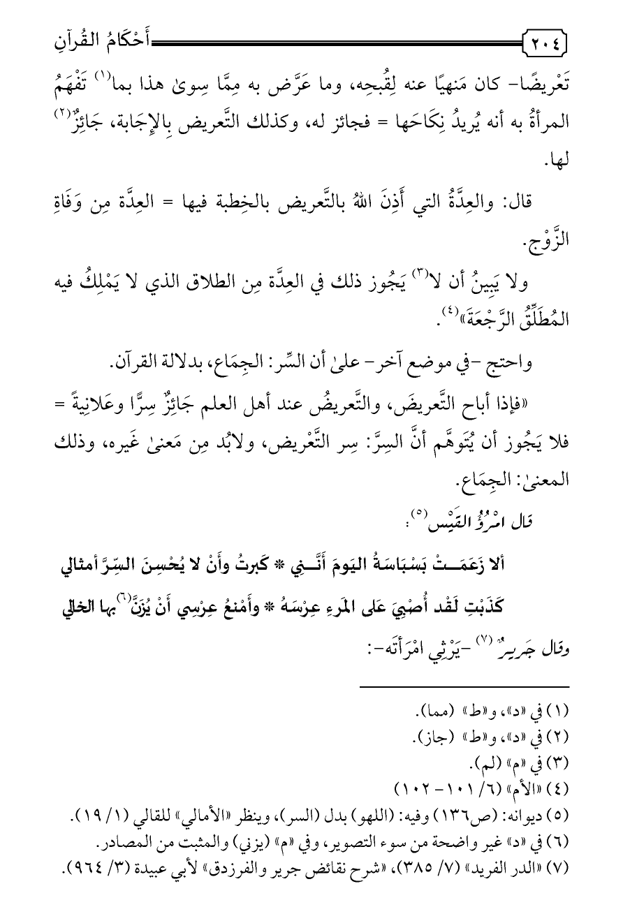 «فإذا أباح التَّعريضَ، والتَّعريضُ عند أهل العلم جَائِزٌ سِرًّا وعَلانِيةً = فلا يَجُوز أن يُتَوهَّم أنَّ السِرَّ: سِر التَّعْريض، ولابُد مِن مَعنى غَيره، وذلك المعنى: الجِمَاع.