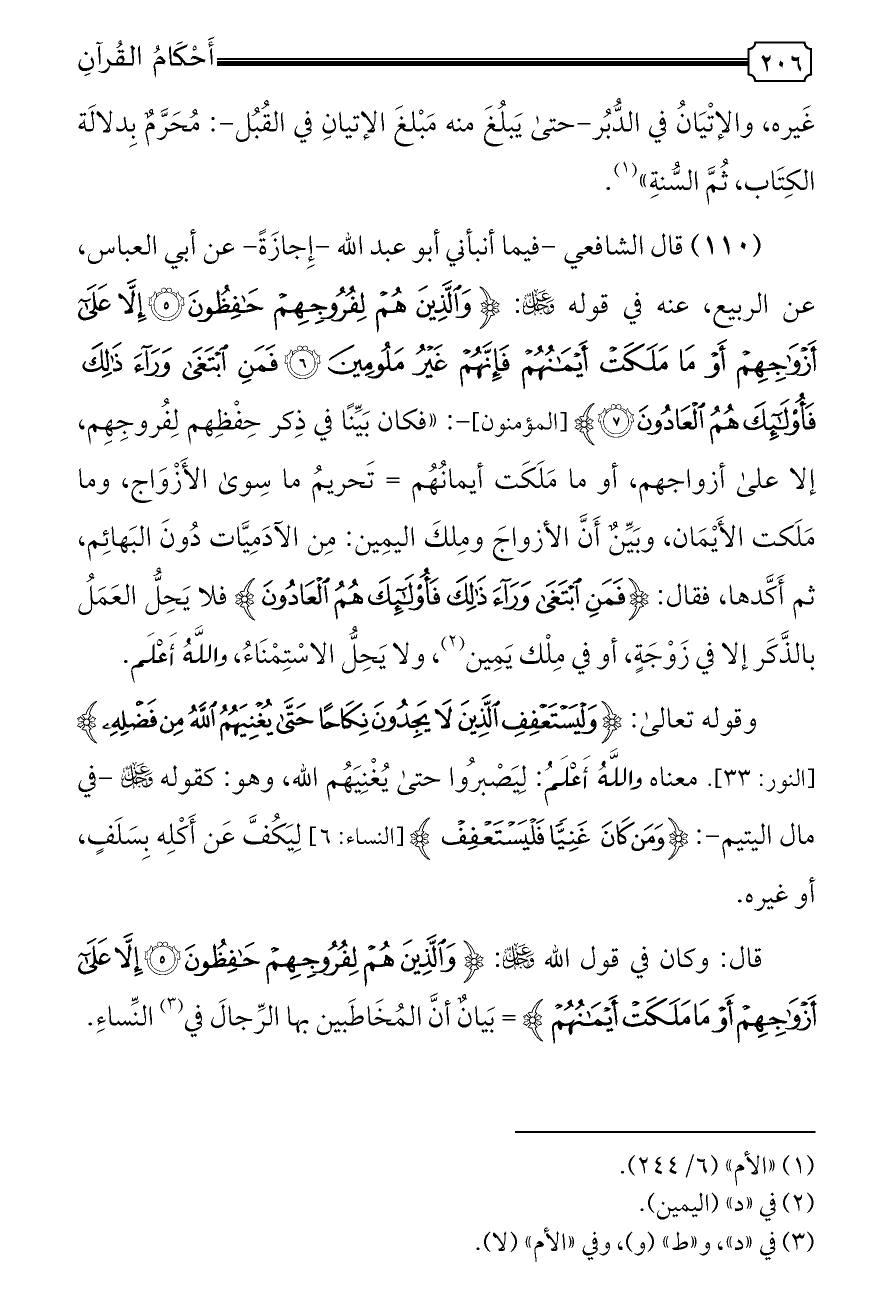 (١١٠) قال الشافعي -فيما أنبأني أبو عبد الله -إِجازَةً- عن أبي العباس، عن الربيع، عنه في قوله - عز وجل -: {وَالَّذِينَ هُمْ لِفُرُوجِهِمْ حَافِظُونَ (٥) إِلَّا عَلَى أَزْوَاجِهِمْ أَوْ مَا مَلَكَتْ أَيْمَانُهُمْ فَإِنَّهُمْ غَيْرُ مَلُومِينَ (٦) فَمَنِ ابْتَغَى وَرَاءَ ذَلِكَ فَأُولَئِكَ هُمُ الْعَادُونَ (٧)} [المؤمنون]-: «فكان بَيِّنًا في ذِكر حِفْظِهم لِفُروجِهِم، إلا على أزواجهم، أو ما مَلَكَت أيمانُهُم = تَحريمُ ما سِوى الأَزْوَاج، وما مَلَكت الأَيْمَان، وبَيِّنٌ أَنَّ الأزواجَ ومِلكَ اليمِين: مِن الآدَمِيَّات دُونَ البَهائِم، ثم أَكَّدها، فقال: {فَمَنِ ابْتَغَى وَرَاءَ ذَلِكَ فَأُولَئِكَ هُمُ الْعَادُونَ} فلا يَحِلُّ العَمَلُ بالذَّكَر إلا في زَوْجَةٍ، أو في مِلْك يَمِين (¬٢)، ولا يَحِلُّ الاسْتِمْنَاءُ، واللَّهُ أَعْلَم.