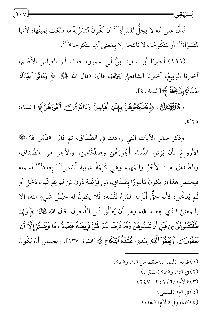 (١١١) أخبرنا أبو سعيد ابنُ أبي عَمرو، حدثنا أبو العباس الأَصَم، أخبرنا الربيعُ، أخبرنا الشافعيُّ - رحمه الله -، قال: «قال الله - عز وجل -: {وَآتُوا النِّسَاءَ صَدُقَاتِهِنَّ نِحْلَةً} [النساء: ٤].