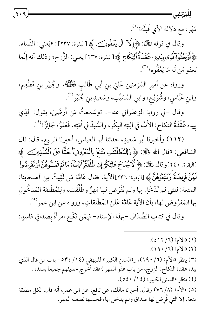 (¬٣) ينظر «الأم» (٦/ ١٩٠)، و «السنن الكبير» للبيهقي (١٤/ ٥٣٤ - باب من قال الذي بيده عقدة النكاح: الزوج، من باب عفو المهر) فقد أخرج حديثهم جميعا بسنده.