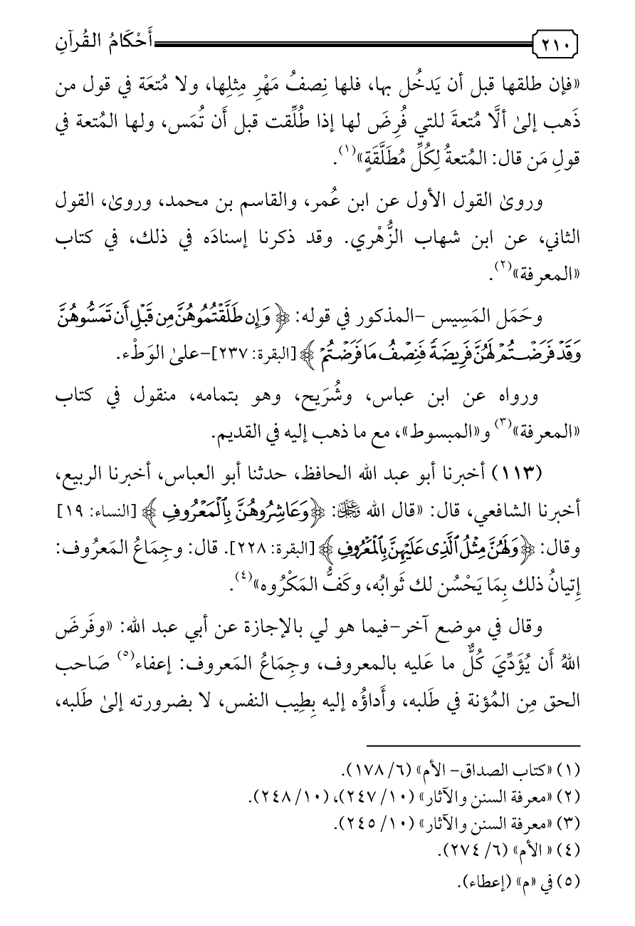 (١١٣) أخبرنا أبو عبد الله الحافظ، حدثنا أبو العباس، أخبرنا الربيع، أخبرنا الشافعي، قال: «قال الله - عز وجل -: {وَعَاشِرُوهُنَّ بِالْمَعْرُوفِ} [النساء: ١٩] وقال: {وَلَهُنَّ مِثْلُ الَّذِي عَلَيْهِنَّ بِالْمَعْرُوفِ} [البقرة: ٢٢٨]. قال: وجِمَاعُ المَعرُوف: إِتيانُ ذلك بِمَا يَحْسُن لك ثَوابُه، وكَفُّ المَكْرُوه» (¬٤).