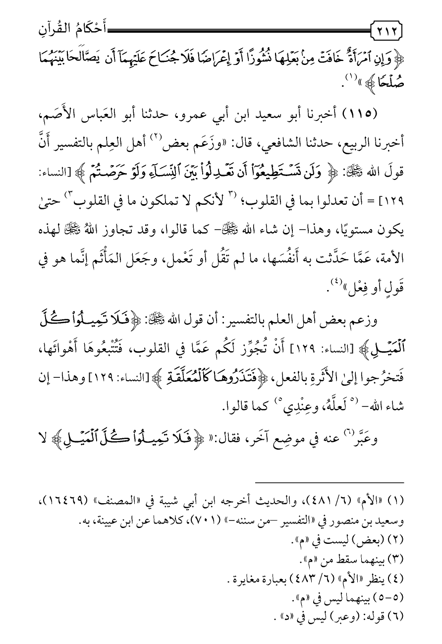 (١١٥) أخبرنا أبو سعيد ابن أبي عمرو، حدثنا أبو العَباس الأَصَم، أخبرنا الربيع، حدثنا الشافعي، قال: «وزَعَم بعض (¬٢) أهل العِلم بالتفسير أَنَّ قولَ الله - عز وجل -: {وَلَنْ تَسْتَطِيعُوا أَنْ تَعْدِلُوا بَيْنَ النِّسَاءِ وَلَوْ حَرَصْتُمْ} [النساء: ١٢٩] = أن تعدلوا بما في القلوب؛ (¬٣) لأنكم لا تملكون ما في القلوب ٣) حتى يكون مستويًا، وهذا- إن شاء الله - عز وجل - كما قالوا، وقد تجاوز اللهُ - عز وجل - لهذه الأمة، عَمَّا حَدَّثت به أَنفُسَها، ما لم تَقُل أو تَعْمل، وجَعَل المَأْثَم إنَّما هو في قَولٍ أو فِعْل» (¬٤).