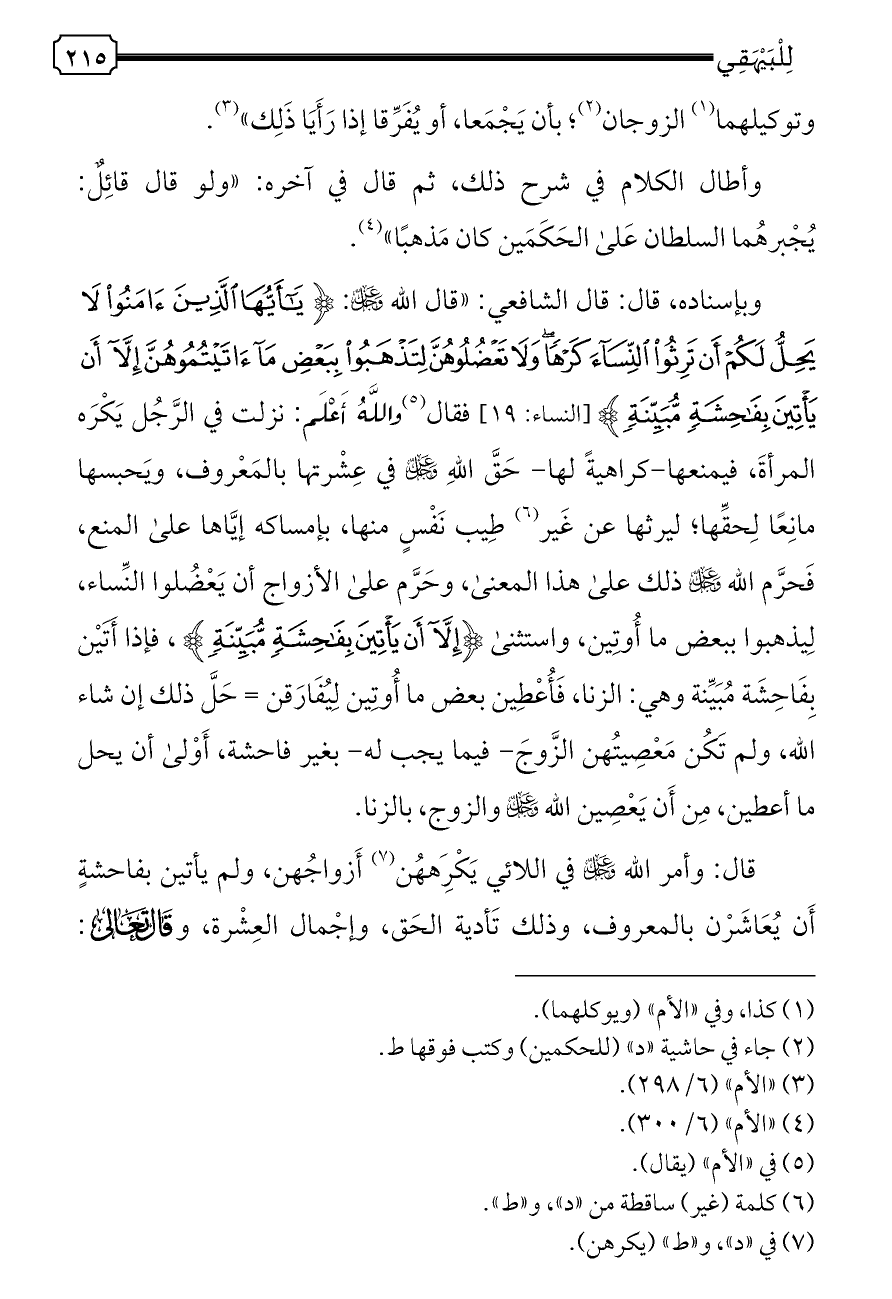 وبإسناده، قال: قال الشافعي: «قال الله - عز وجل -: {يَاأَيُّهَا الَّذِينَ آمَنُوا لَا يَحِلُّ لَكُمْ أَنْ تَرِثُوا النِّسَاءَ كَرْهًا وَلَا تَعْضُلُوهُنَّ لِتَذْهَبُوا بِبَعْضِ مَا آتَيْتُمُوهُنَّ إِلَّا أَنْ يَأْتِينَ بِفَاحِشَةٍ مُبَيِّنَةٍ} [النساء: ١٩] فقال (¬٥) واللَّهُ أَعْلَم: نزلت في الرَّجُل يَكْرَه المرأةَ، فيمنعها-كراهيةً لها- حَقَّ اللهِ - عز وجل - في عِشْرتها بالمَعْروف، ويَحبسها