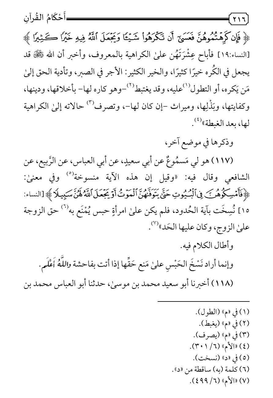 (١١٧) هو لي مَسمُوعٌ عن أبي سعيدٍ، عن أبي العباس، عن الرَّبيع، عن الشافعي وقال فيه: «وقيل إن هذه الآية منسوخة (¬٥) وفي معنى: {فَأَمْسِكُوهُنَّ فِي الْبُيُوتِ حَتَّى يَتَوَفَّاهُنَّ الْمَوْتُ أَوْ يَجْعَلَ اللَّهُ لَهُنَّ سَبِيلًا} [النساء: ١٥] نُسِخَت بآية الحُدود، فلم يكن على امرأةٍ حبس يُمْنَع به (¬٦) حق الزوجة على الزوج، وكان عليها الحَد» (¬٧).