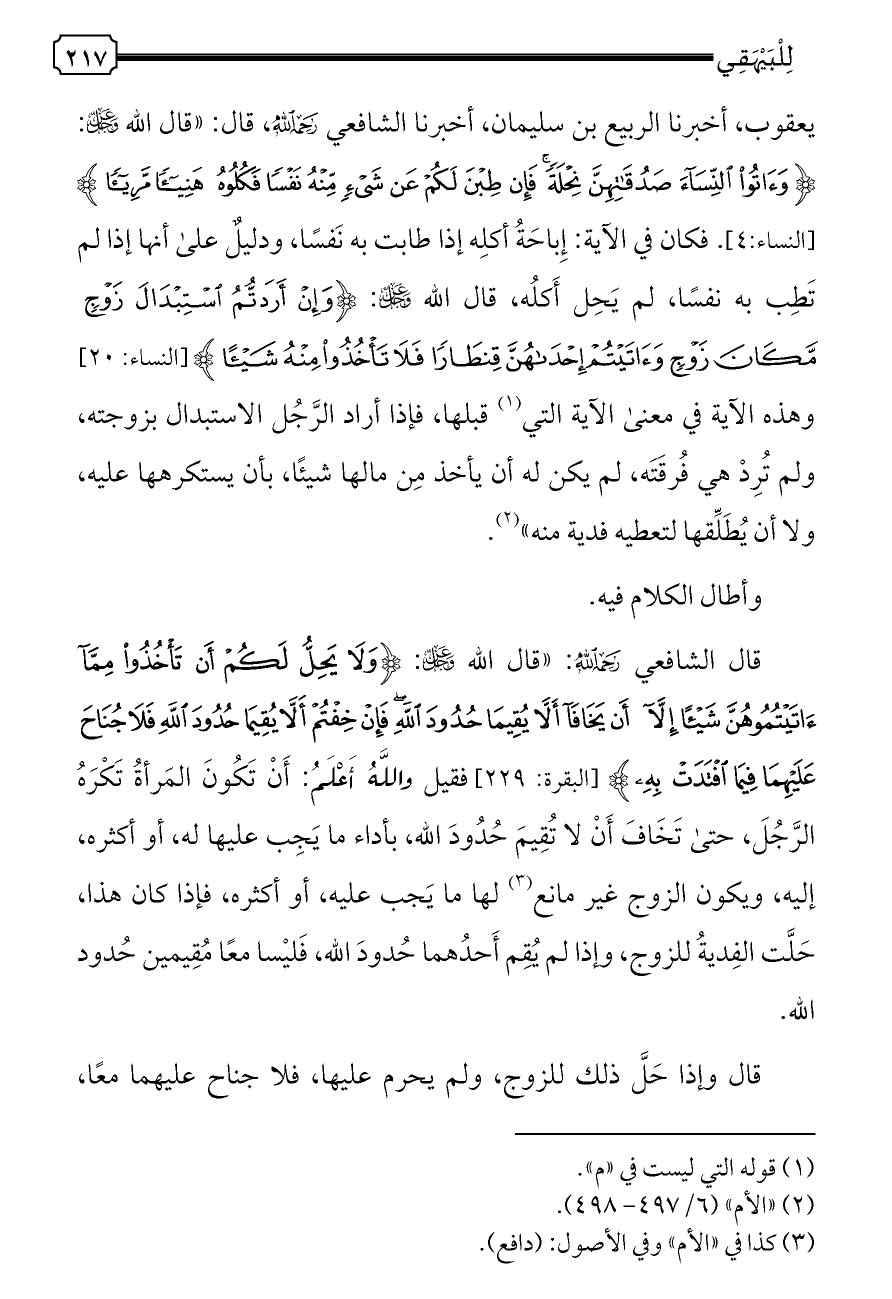 {وَآتُوا النِّسَاءَ صَدُقَاتِهِنَّ نِحْلَةً فَإِنْ طِبْنَ لَكُمْ عَنْ شَيْءٍ مِنْهُ نَفْسًا فَكُلُوهُ هَنِيئًا مَرِيئًا} [النساء: ٤]. فكان في الآية: إِباحَةُ أكلِه إذا طابت به نَفسًا، ودليلٌ على أنها إذا لم تَطِب به نفسًا، لم يَحِل أَكلُه، قال الله - عز وجل -: {وَإِنْ أَرَدْتُمُ اسْتِبْدَالَ زَوْجٍ مَكَانَ زَوْجٍ وَآتَيْتُمْ إِحْدَاهُنَّ قِنْطَارًا فَلَا تَأْخُذُوا مِنْهُ شَيْئًا} [النساء: ٢٠] وهذه الآية في معنى الآية التي (¬١) قبلها، فإذا أراد الرَّجُل الاستبدال بزوجته، ولم تُرِدْ هي فُرقَتَه، لم يكن له أن يأخذ مِن مالها شيئًا، بأن يستكرهها عليه، ولا أن يُطَلِّقها لتعطيه فدية منه» (¬٢).