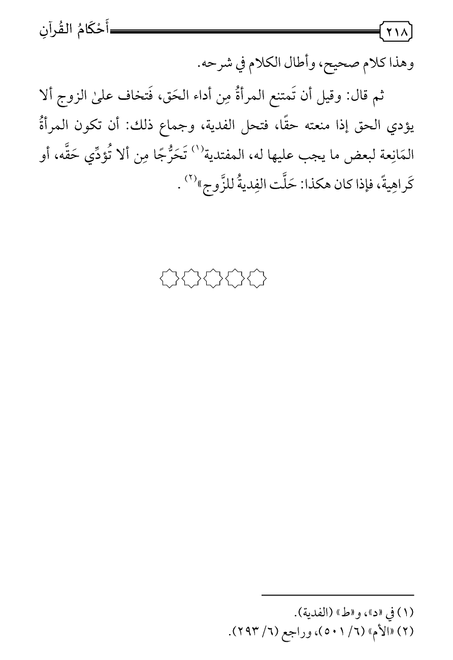 ثم قال: وقيل أن تَمتنع المرأةُ مِن أداء الحَق، فَتخاف على الزوج ألا يؤدي الحق إذا منعته حقًا، فتحل الفدية، وجماع ذلك: أن تكون المرأةُ المَانِعة لبعض ما يجب عليها له، المفتدية (¬١) تَحَرُّجًا مِن ألا تُؤدِّي حَقَّه، أو كَراهِيةً، فإذا كان هكذا: حَلَّت الفِديةُ للزَّوج» (¬٢).
