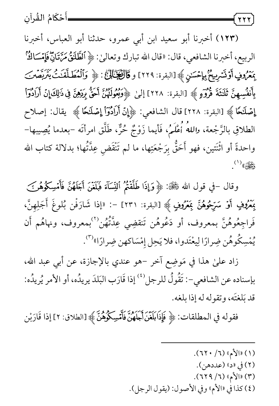 (١٢٣) أخبرنا أبو سعيد ابن أبي عمرو، حدثنا أبو العباس، أخبرنا الربيع، أخبرنا الشافعي، قال: «قال الله تبارك وتعالى: {الطَّلَاقُ مَرَّتَانِ فَإِمْسَاكٌ بِمَعْرُوفٍ أَوْ تَسْرِيحٌ بِإِحْسَانٍ} [البقرة: ٢٢٩] وقال تعالى: {وَالْمُطَلَّقَاتُ يَتَرَبَّصْنَ بِأَنْفُسِهِنَّ ثَلَاثَةَ قُرُوءٍ} [البقرة: ٢٢٨] إلى {وَبُعُولَتُهُنَّ أَحَقُّ بِرَدِّهِنَّ فِي ذَلِكَ إِنْ أَرَادُوا إِصْلَاحًا} [البقرة: ٢٢٨] قال الشافعي: {إِنْ أَرَادُوا إِصْلَاحًا} يقال: إصلاح الطلاقِ بالرَّجْعة، واللهُ أُعْلَمُ، فَأيما زَوْجٌ حُرٌّ، طَلَّق امرأتَه -بعدما يُصِيبها- واحدةً أو اثْنَتين، فهو أَحَقُّ بِرَجْعَتِها، ما لم تَنْقَضِ عِدَّتُها؛ بدلالة كتاب الله - عز وجل -» (¬١).