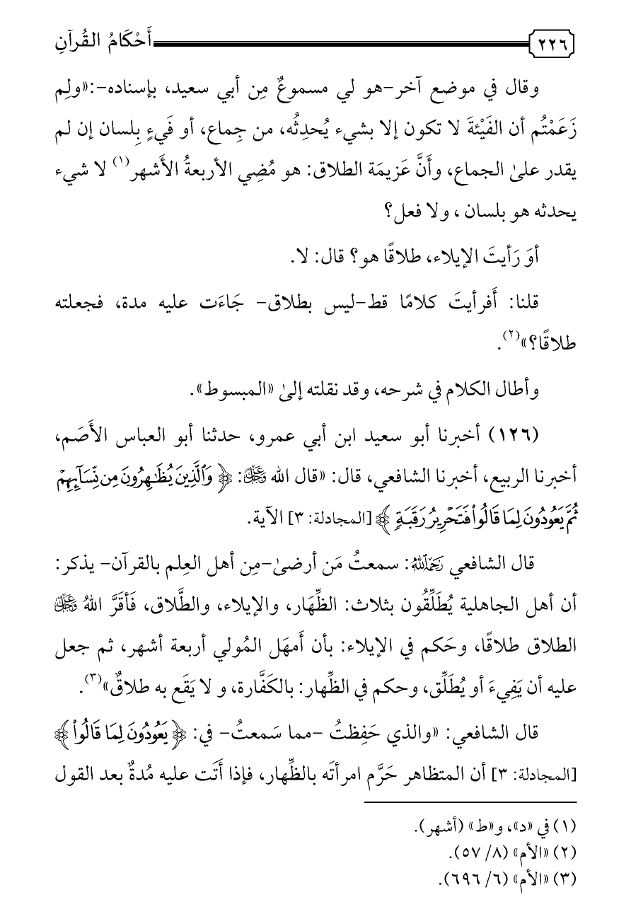 (١٢٦) أخبرنا أبو سعيد ابن أبي عمرو، حدثنا أبو العباس الأَصَم، أخبرنا الربيع، أخبرنا الشافعي، قال: «قال الله - عز وجل -: {وَالَّذِينَ يُظَاهِرُونَ مِنْ نِسَائِهِمْ ثُمَّ يَعُودُونَ لِمَا قَالُوا فَتَحْرِيرُ رَقَبَةٍ} [المجادلة: ٣] الآية.