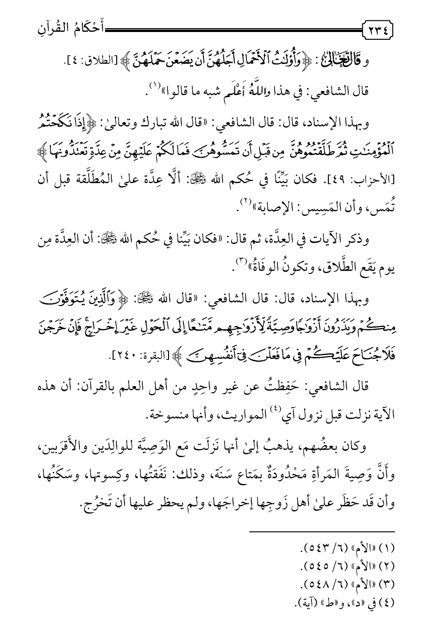 وبهذا الإسناد، قال: قال الشافعي: «قال الله - عز وجل -: {وَالَّذِينَ يُتَوَفَّوْنَ مِنْكُمْ وَيَذَرُونَ أَزْوَاجًا وَصِيَّةً لِأَزْوَاجِهِمْ مَتَاعًا إِلَى الْحَوْلِ غَيْرَ إِخْرَاجٍ فَإِنْ خَرَجْنَ فَلَا جُنَاحَ عَلَيْكُمْ فِي مَا فَعَلْنَ فِي أَنْفُسِهِنَّ} [البقرة: ٢٤٠].