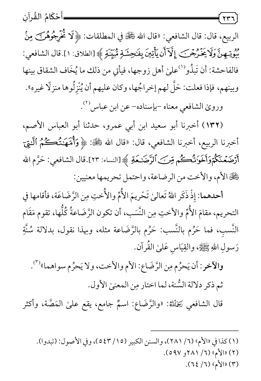 (١٣٢) أخبرنا أبو سعيد ابن أبي عمرو، حدثنا أبو العباس الأصم، أخبرنا الربيع، أخبرنا الشافعي، قال: «قال الله - عز وجل -: {وَأُمَّهَاتُكُمُ اللَّاتِي أَرْضَعْنَكُمْ وَأَخَوَاتُكُمْ مِنَ الرَّضَاعَةِ} [النساء: ٢٣].قال الشافعي: حَرَّم الله - عز وجل - الأم، والأخت من الرضاعة، واحتمل تحريمها معنيين: