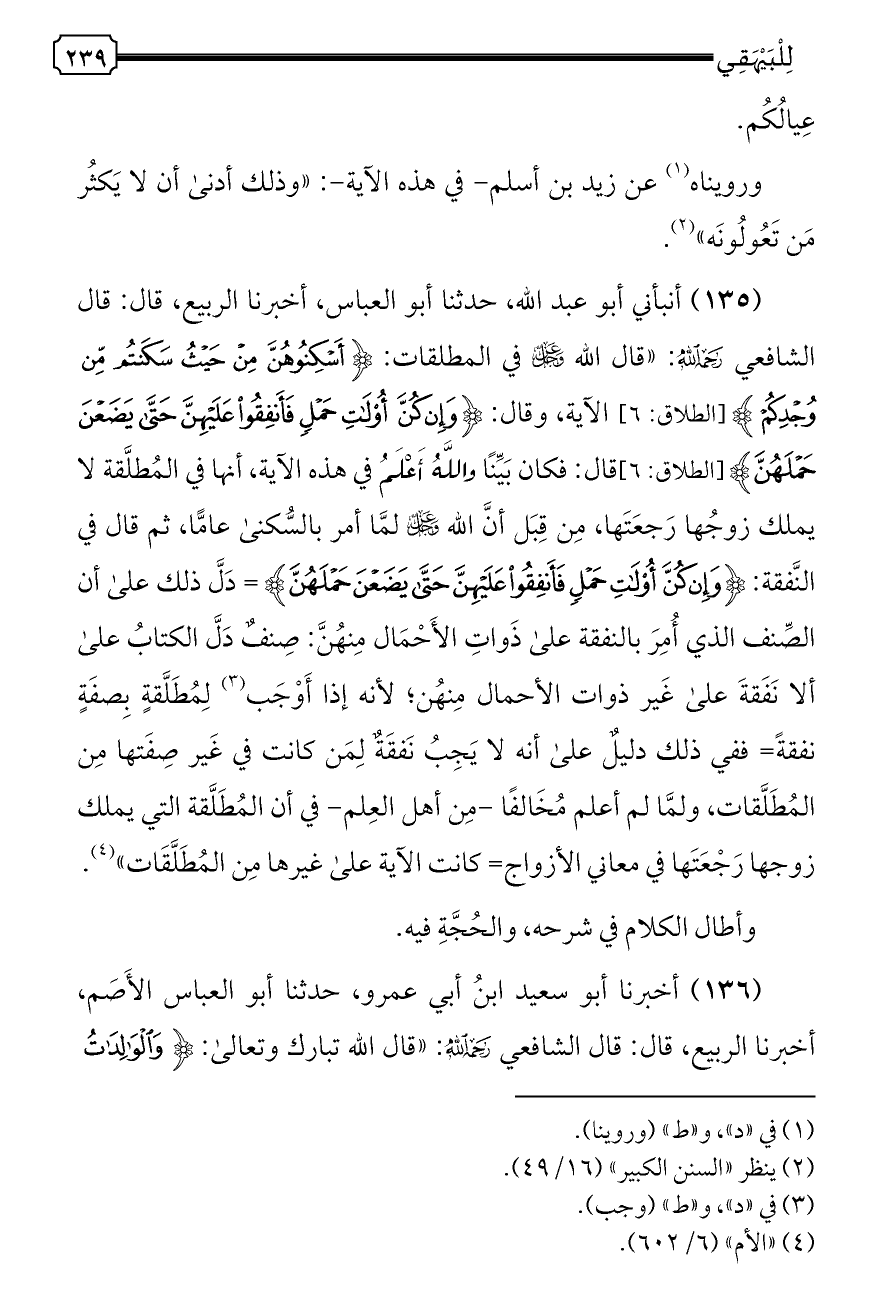 (١٣٥) أنبأني أبو عبد الله، حدثنا أبو العباس، أخبرنا الربيع، قال: قال الشافعي - رحمه الله -: «قال الله - عز وجل - في المطلقات: {أَسْكِنُوهُنَّ مِنْ حَيْثُ سَكَنْتُمْ مِنْ وُجْدِكُمْ} [الطلاق: ٦] الآية، وقال: {وَإِنْ كُنَّ أُولَاتِ حَمْلٍ فَأَنْفِقُوا عَلَيْهِنَّ حَتَّى يَضَعْنَ حَمْلَهُنَّ} [الطلاق: ٦] قال: فكان بَيِّنًا واللَّهُ أَعْلَمُ في هذه الآية، أنها في المُطلَّقة لا يملك زوجُها رَجعَتَها، مِن قِبَل أنَّ الله - عز وجل - لمَّا أمر بالسُّكنى عامًّا، ثم قال في النَّفقة: {وَإِنْ كُنَّ أُولَاتِ حَمْلٍ فَأَنْفِقُوا عَلَيْهِنَّ حَتَّى يَضَعْنَ حَمْلَهُنَّ} = دَلَّ ذلك على أن الصِّنف الذي أُمِرَ بالنفقة على ذَواتِ الأَحْمَال مِنهُنَّ: صِنفٌ دَلَّ الكتابُ على ألا نَفَقةَ على غَير ذوات الأحمال مِنهُن؛ لأنه إذا أَوْجَب (¬٣) لِمُطَلَّقةٍ بِصفَةٍ نفقةً= ففي ذلك دليلٌ على أنه لا يَجِبُ نَفقَةٌ لِمَن كانت في غَير صِفَتها مِن المُطَلَّقات، ولمَّا لم أعلم مُخَالفًا -مِن أهل العِلم- في أن المُطَلَّقة التي يملك