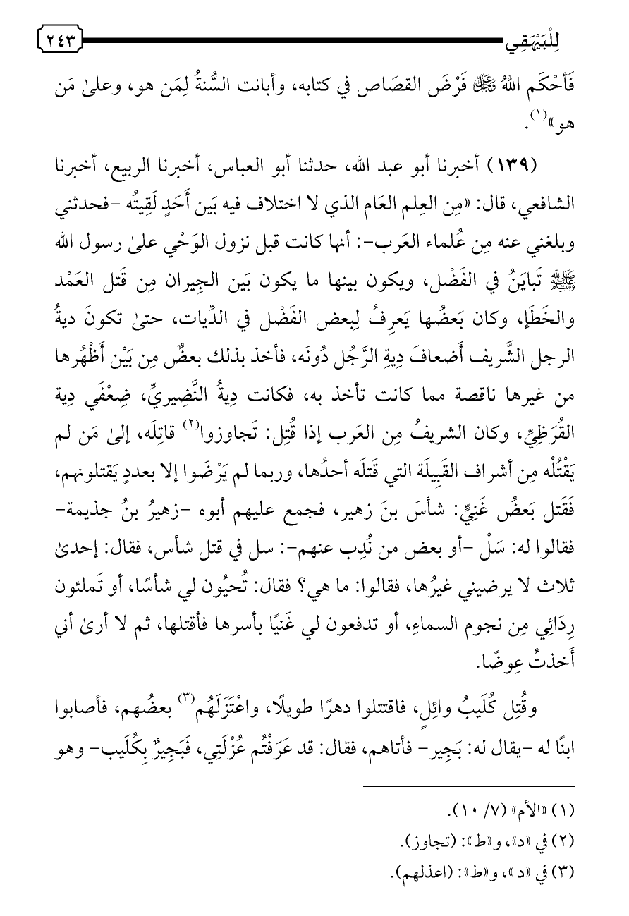 (١٣٩) أخبرنا أبو عبد الله، حدثنا أبو العباس، أخبرنا الربيع، أخبرنا الشافعي، قال: «مِن العِلم العَام الذي لا اختلاف فيه بَين أَحَدٍ لَقِيتُه -فحدثني وبلغني عنه مِن عُلماء العَرب-: أنها كانت قبل نزول الوَحْي على رسول الله - صلى الله عليه وسلم - تَبايَنُ في الفَضْل، ويكون بينها ما يكون بَين الجِيران مِن قَتل العَمْد والخَطَإ، وكان بَعضُها يَعرِفُ لِبعض الفَضْل في الدِّيات، حتى تكونَ ديةُ الرجل الشَّريف أَضعافَ دِيةِ الرَّجُل دُونَه، فأخذ بذلك بعضٌ مِن بَيْن أَظْهُرها من غيرها ناقصة مما كانت تأخذ به، فكانت دِيةُ النَّضِيريِّ، ضِعْفَي دِية القُرَظِيِّ، وكان الشريفُ مِن العَرب إذا قُتِل: تَجاوزوا (¬٢) قاتِلَه، إلى مَن لم يَقْتُلْه مِن أشراف القَبِيلَة التي قَتلَه أحدُها، وربما لم يَرْضَوا إلا بعددٍ يَقتلونهم، فَقَتل بَعضُ غَنِيٍّ: شأسَ بنَ زهير، فجمع عليهم أبوه -زهيرُ بنُ جذيمة- فقالوا له: سَلْ -أو بعض من نُدِب عنهم-: سل في قتل شأس، فقال: إحدى ثلاث لا يرضيني غيرُها، فقالوا: ما هي؟ فقال: تُحيُون لي شأسًا، أو تَملئون رِدَائِي مِن نجوم السماءِ، أو تدفعون لي غَنيًا بأسرها فأقتلها، ثم لا أرى أني أَخذتُ عِوضًا.
