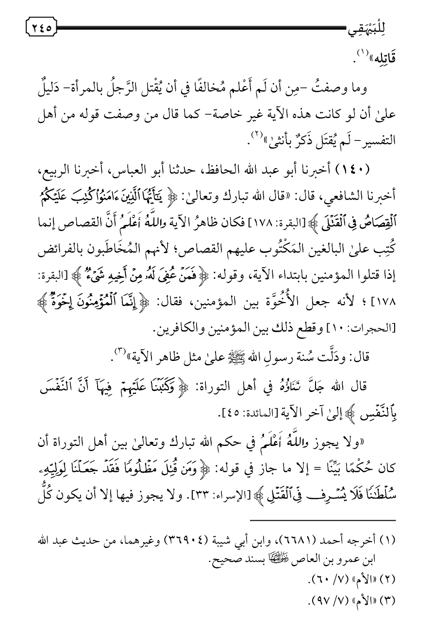 (١٤٠) أخبرنا أبو عبد الله الحافظ، حدثنا أبو العباس، أخبرنا الربيع، أخبرنا الشافعي، قال: «قال الله تبارك وتعالى: {يَاأَيُّهَا الَّذِينَ آمَنُوا كُتِبَ عَلَيْكُمُ الْقِصَاصُ فِي الْقَتْلَى} [البقرة: ١٧٨] فكان ظاهرُ الآية واللَّهُ أَعْلَمُ أَنَّ القصاص إنما كُتِب على البالغين المَكْتُوب عليهم القصاص؛ لأنهم المُخَاطَبون بالفرائض