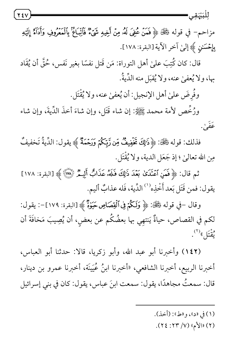 (١٤٢) وأخبرنا أبو عبد الله، وأبو زكريا، قالا: حدثنا أبو العباس، أخبرنا الربيع، أخبرنا الشافعي، «أخبرنا ابنُ عُيَينَة، أخبرنا عمرو بن دينار، قال: سمعتُ مجاهدًا، يقول: سمعت ابنَ عباس، يقول: كان في بني إسرائيل
