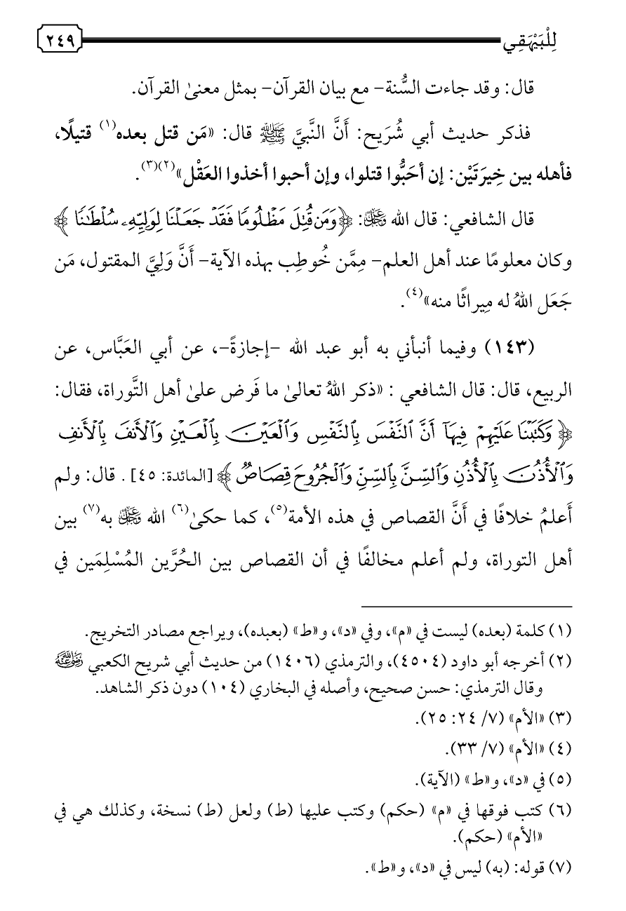 (١٤٣) وفيما أنبأني به أبو عبد الله -إجازةً-، عن أبي العَبَّاس، عن الربيع، قال: قال الشافعي: «ذكر اللهُ تعالى ما فَرض على أهل التَّوراة، فقال: