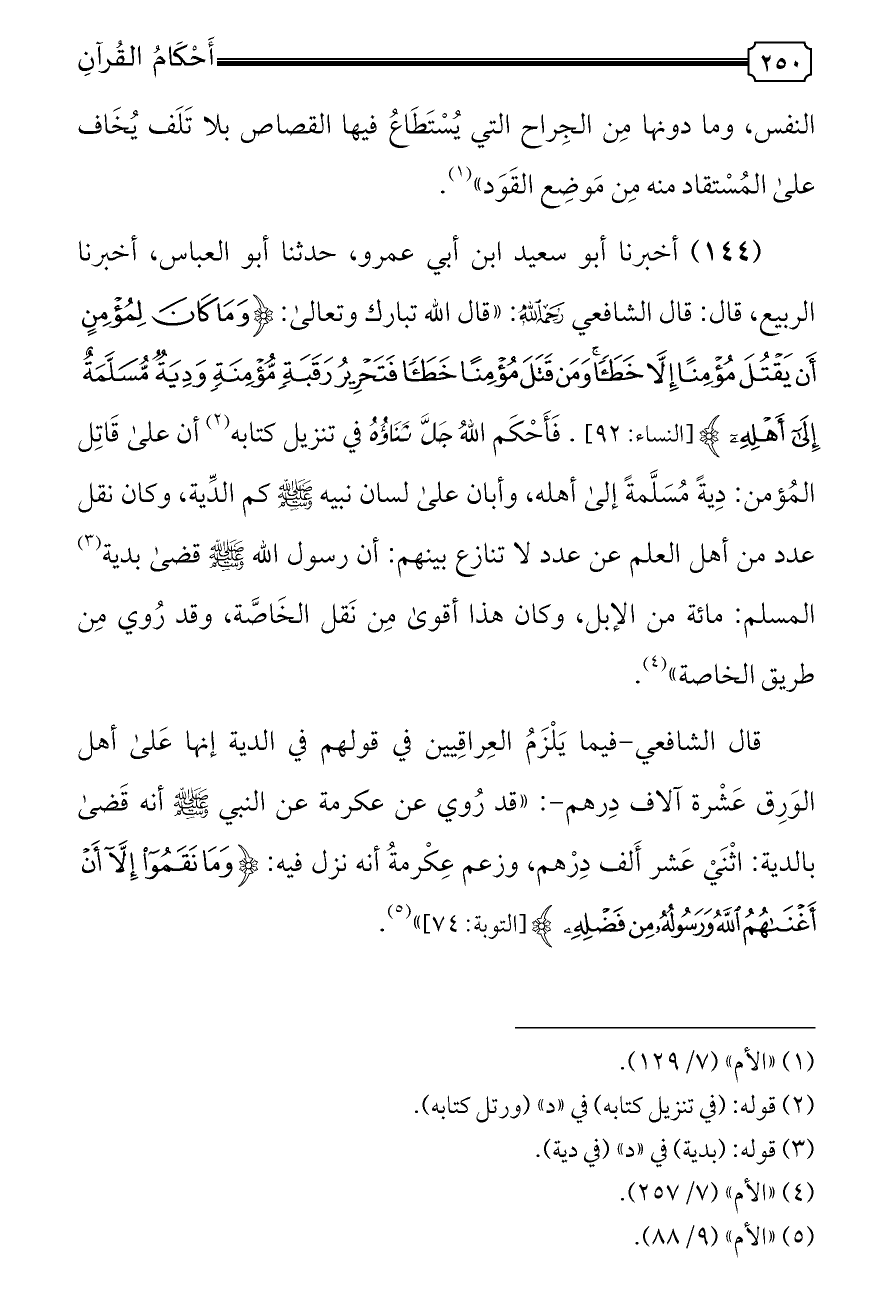 (١٤٤) أخبرنا أبو سعيد ابن أبي عمرو، حدثنا أبو العباس، أخبرنا الربيع، قال: قال الشافعي - رحمه الله -: «قال الله تبارك وتعالى: {وَمَا كَانَ لِمُؤْمِنٍ أَنْ يَقْتُلَ مُؤْمِنًا إِلَّا خَطَأً وَمَنْ قَتَلَ مُؤْمِنًا خَطَأً فَتَحْرِيرُ رَقَبَةٍ مُؤْمِنَةٍ وَدِيَةٌ مُسَلَّمَةٌ إِلَى أَهْلِهِ} [النساء: ٩٢]. فَأَحْكَم اللهُ جَلَّ ثَنَاؤُهُ في تنزيل كتابه (¬٢) أن على قَاتِل المُؤمن: دِيةً مُسَلَّمةً إلى أهله، وأبان على لسان نبيه - صلى الله عليه وسلم - كم الدِّية، وكان نقل عدد من أهل العلم عن عدد لا تنازع بينهم: أن رسول الله - صلى الله عليه وسلم - قضى بدية (¬٣) المسلم: مائة من الإبل، وكان هذا أقوى مِن نَقل الخَاصَّة، وقد رُوي مِن طريق الخاصة» (¬٤).