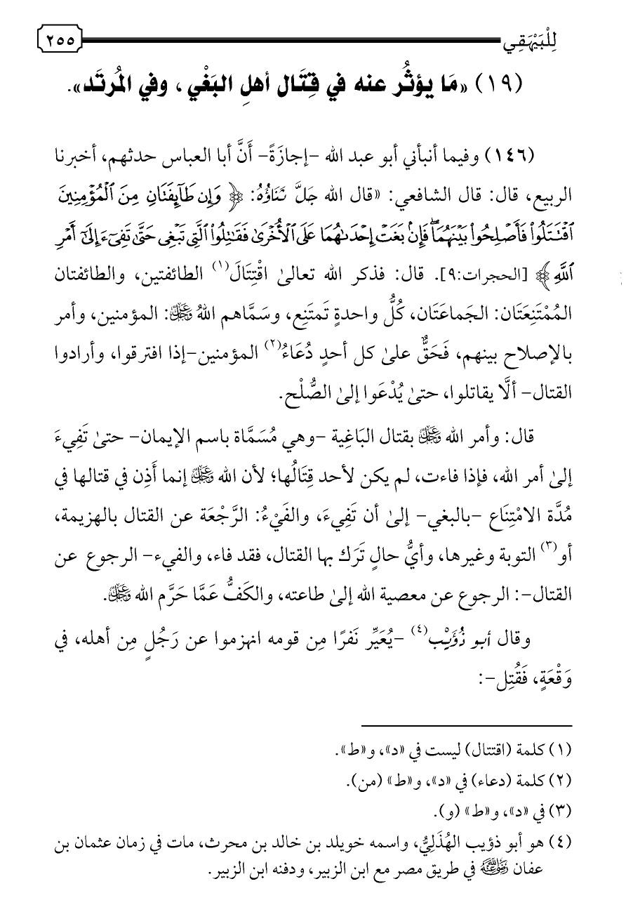 (١٤٦) وفيما أنبأني أبو عبد الله -إجازَةً- أَنَّ أبا العباس حدثهم، أخبرنا الربيع، قال: قال الشافعي: «قال الله جَلَّ ثَنَاؤُهُ: {وَإِنْ طَائِفَتَانِ مِنَ الْمُؤْمِنِينَ اقْتَتَلُوا فَأَصْلِحُوا بَيْنَهُمَا فَإِنْ بَغَتْ إِحْدَاهُمَا عَلَى الْأُخْرَى فَقَاتِلُوا الَّتِي تَبْغِي حَتَّى تَفِيءَ إِلَى أَمْرِ اللَّهِ} [الحجرات: ٩]. قال: فذكر الله تعالى اقْتِتَالَ (¬١) الطائفتين، والطائفتان المُمْتَنِعَتَان: الجَماعَتَان، كُلُّ واحدةٍ تَمتَنِع، وسَمَّاهم اللهُ - عز وجل -: المؤمنين، وأمر