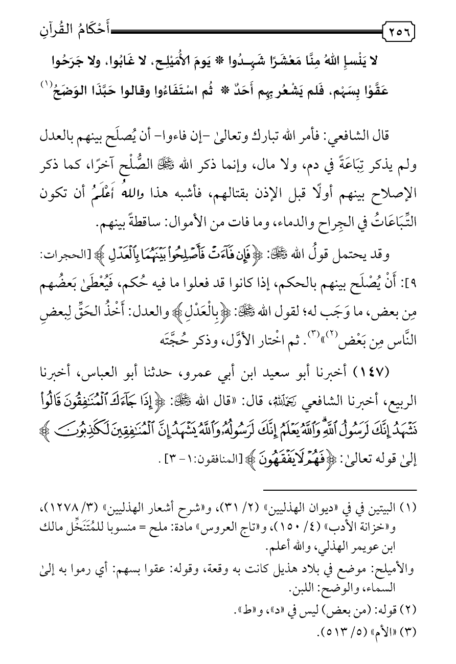 وقد يحتمل قولُ الله - عز وجل -: {فَإِنْ فَاءَتْ فَأَصْلِحُوا بَيْنَهُمَا بِالْعَدْلِ} [الحجرات: ٩]: أَنْ يُصْلَح بينهم بالحكم، إذا كانوا قد فعلوا ما فيه حُكم، فَيُعْطَى بَعضُهم مِن بعض، ما وَجَب له؛ لقول الله - عز وجل -: {بِالْعَدْلِ} والعدل: أَخْذُ الحَقِّ لِبعضِ النَّاس مِن بَعْض (¬٢)» (¬٣). ثم اخْتار الأوَّل، وذكر حُجَّتَه