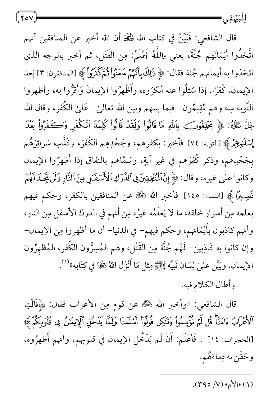 قال الشافعي: فَبَيِّنٌ في كتاب الله - عز وجل - أن الله أخبر عن المنافقين أنهم اتَّخذُوا أَيْمَانَهم جُنَّةً، يعني واللَّهُ أَعْلَمُ: مِن القَتْل، ثم أخبر بالوجه الذي اتخذوا به أيمانهم جُنة فقال: {ذَلِكَ بِأَنَّهُمْ آمَنُوا ثُمَّ كَفَرُوا} [المنافقون: ٣] بَعد الإيمان، كُفرًا، إذا سُئِلُوا عنه أنكرُوه، وأَظْهرُوا الإيمانَ وَأَقرُّوا به، وأظهروا التَّوبة مِنه وهم مُقِيمُون -فيما بينهم وبين الله تعالى- عَلى الكُفر، وقال الله جَلَّ ثَنَاؤُهُ: {يَحْلِفُونَ بِاللَّهِ مَا قَالُوا وَلَقَدْ قَالُوا كَلِمَةَ الْكُفْرِ وَكَفَرُوا بَعْدَ إِسْلَامِهِمْ} [التوبة: ٧٤] فأخبر: بكفرهم، وجَحْدِهِم الكُفرَ، وكَذَّب سَرائِرَهُم بِجَحْدِهم، وذكر كُفرَهم في غير آيةٍ، وسَمَّاهم بالنفاق إذا أَظهرُوا الإيمان وكانوا على غيره، وقال: {إِنَّ الْمُنَافِقِينَ فِي الدَّرْكِ الْأَسْفَلِ مِنَ النَّارِ وَلَنْ تَجِدَ لَهُمْ نَصِيرًا} [النساء: ١٤٥] فأخبر الله - عز وجل - عن المنافقين بالكفر، وحكم فيهم بعلمه مِن أسرار خلقه، ما لا يَعلَمُه غيرُه مِن أنهم في الدرك الأسفل مِن النار، وأنهم كاذبون بأَيْمَانهم، وحكم فيهم- في الدنيا- أن ما أظهروا مِن الإيمان- وإن كانوا به كَاذِبين- لَهُم جُنَّة مِن القَتْل، وهم المُسِرُّون الكُفر، المُظهِرُون