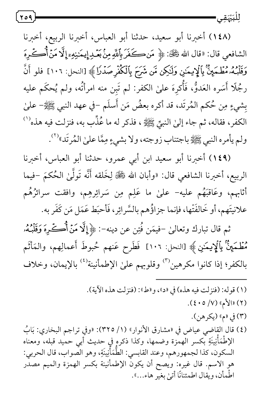 (١٤٨) أخبرنا أبو سعيد، حدثنا أبو العباس، أخبرنا الربيع، أخبرنا الشافعي قال: «قال الله - عز وجل -: {مَنْ كَفَرَ بِاللَّهِ مِنْ بَعْدِ إِيمَانِهِ إِلَّا مَنْ أُكْرِهَ وَقَلْبُهُ مُطْمَئِنٌّ بِالْإِيمَانِ وَلَكِنْ مَنْ شَرَحَ بِالْكُفْرِ صَدْرًا} [النحل: ١٠٦] فلو أَنَّ رجُلًا أَسَره العَدوُّ، فَأُكرِهَ على الكفر: لم تَبِن منه امرأتُه، ولم يُحكَم عليه بِشيءٍ مِن حُكم المُرتَد، قد أكره بعضُ مَن أَسلَم -في عهد النبي - صلى الله عليه وسلم - على الكفر، فقاله، ثم جاء إلى النبيِّ - صلى الله عليه وسلم -، فذكر له ما عُذِّب به، فنزلت فيه هذه (¬١) ولم يأمره النبي - صلى الله عليه وسلم - باجتناب زوجته، ولا بشيءٍ مِمَّا على المُرتَد» (¬٢).
