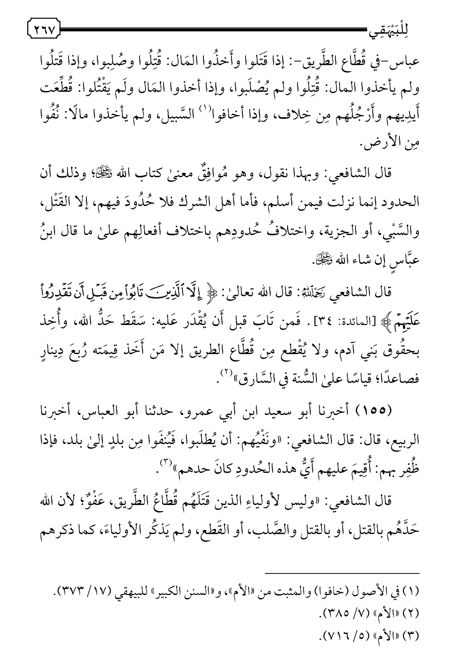 (١٥٥) أخبرنا أبو سعيد ابن أبي عمرو، حدثنا أبو العباس، أخبرنا الربيع، قال: قال الشافعي: «ونَفْيُهم: أن يُطلَبوا، فَيُنفَوا مِن بلدٍ إلى بلد، فإذا ظُفِر بهم: أُقِيمَ عليهم أَيُّ هذه الحُدودِ كانَ حدهم» (¬٣).