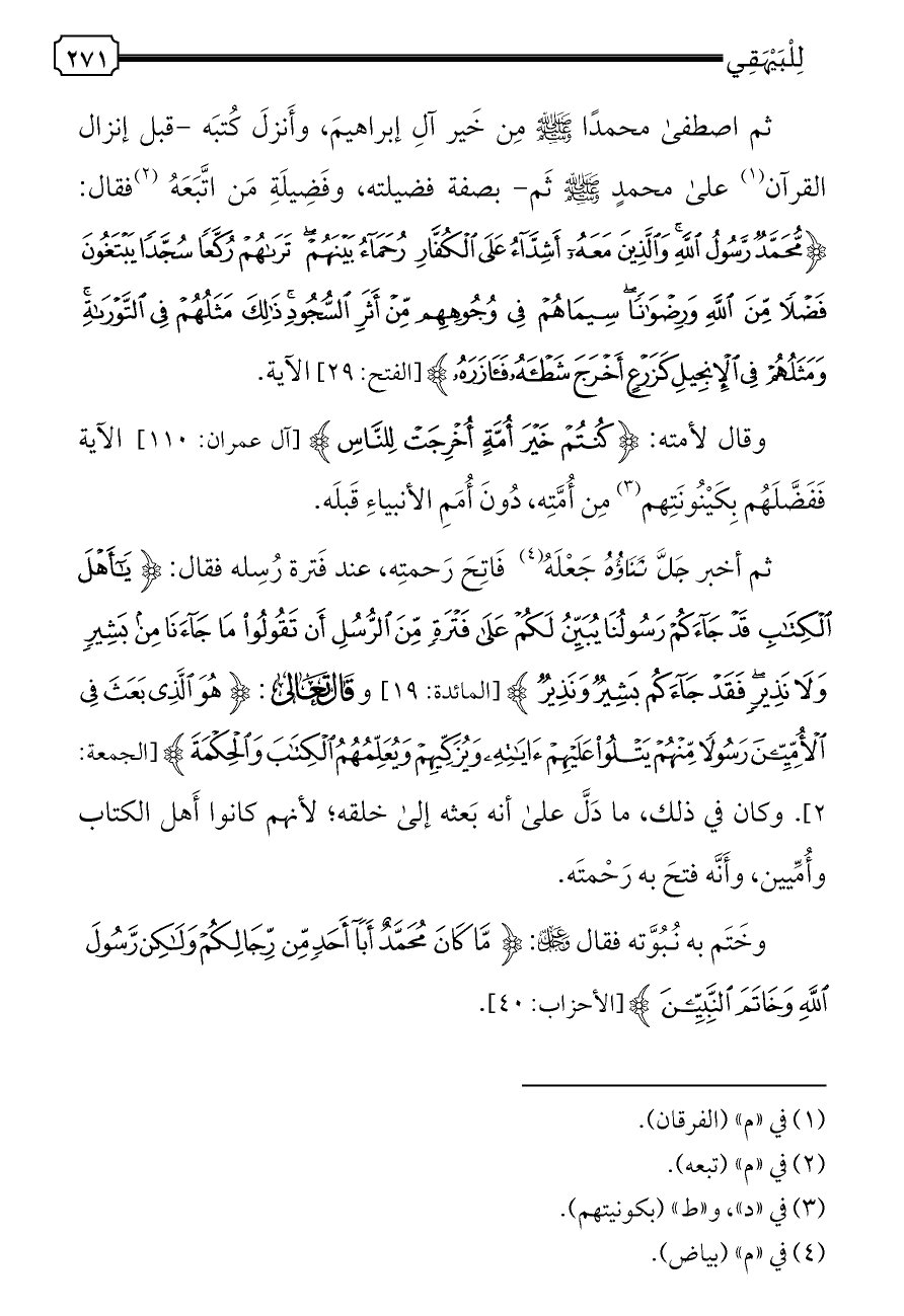 ثم اصطفى محمدًا - صلى الله عليه وسلم - مِن خَير آلِ إبراهيمَ، وأَنزلَ كُتبَه -قبل إنزال القرآن (¬١) على محمدٍ - صلى الله عليه وسلم - ثَم- بصفة فضيلته، وفَضِيلَةِ مَن اتَّبَعَهُ (¬٢) فقال: {مُحَمَّدٌ رَسُولُ اللَّهِ وَالَّذِينَ مَعَهُ أَشِدَّاءُ عَلَى الْكُفَّارِ رُحَمَاءُ بَيْنَهُمْ تَرَاهُمْ رُكَّعًا سُجَّدًا يَبْتَغُونَ فَضْلًا مِنَ اللَّهِ وَرِضْوَانًا سِيمَاهُمْ فِي وُجُوهِهِمْ مِنْ أَثَرِ السُّجُودِ ذَلِكَ مَثَلُهُمْ فِي التَّوْرَاةِ وَمَثَلُهُمْ فِي الْإِنْجِيلِ كَزَرْعٍ أَخْرَجَ شَطْأَهُ فَآزَرَهُ} [الفتح: ٢٩] الآية.