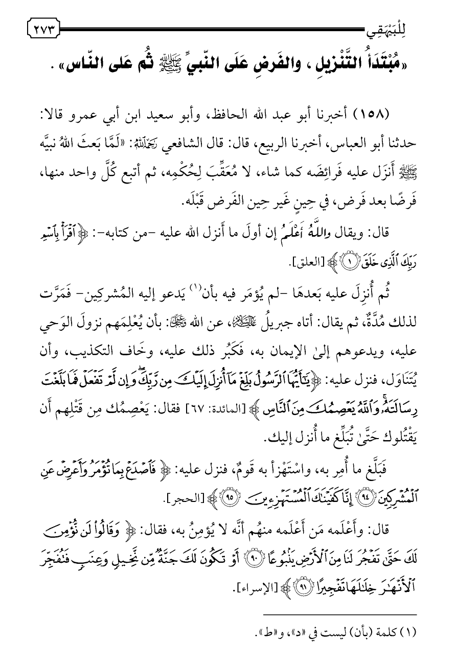 «مُبْتَدَأُ التَّنْزيلِ، والفَرضِ عَلَى النّبيِّ - صلى الله عليه وسلم - ثُم عَلى النّاس».