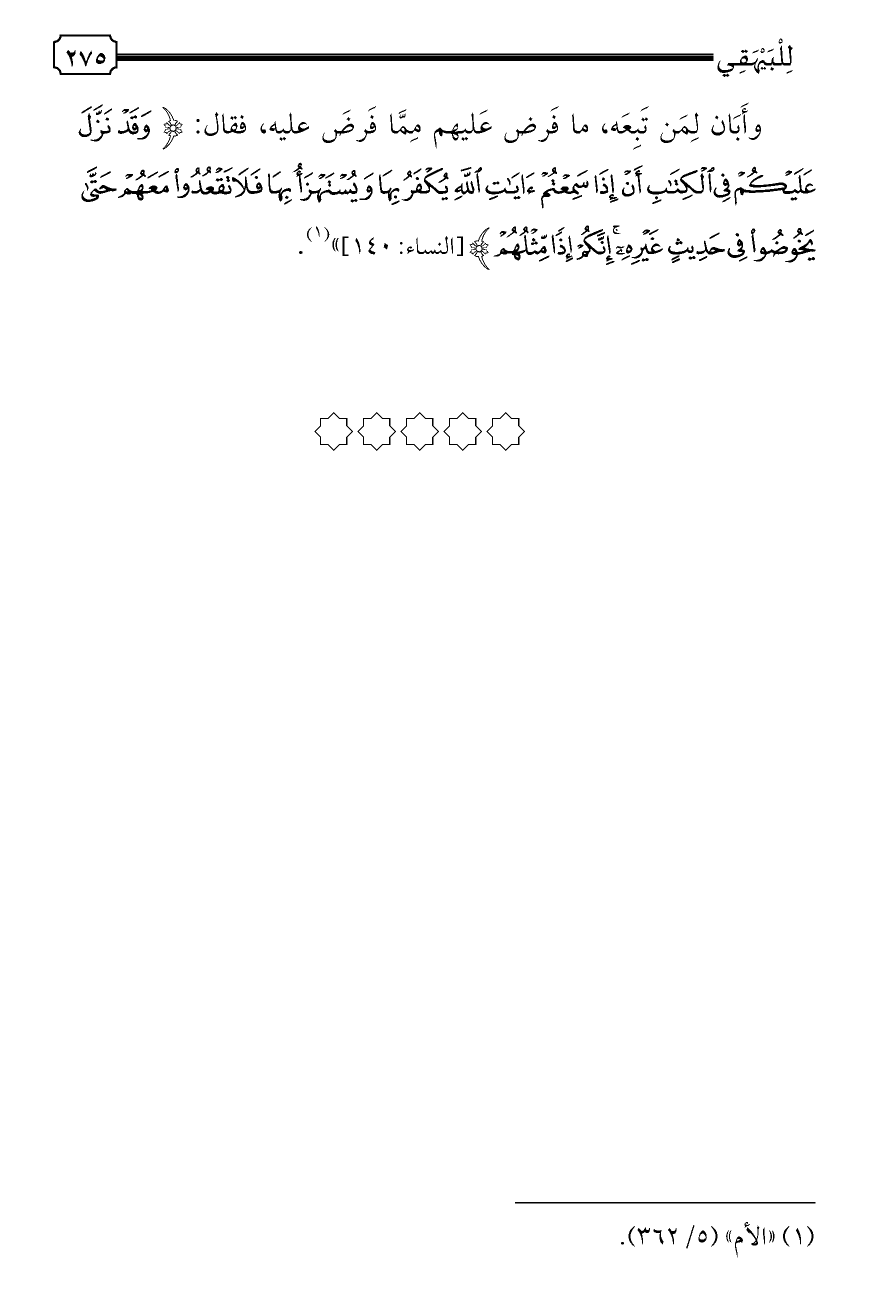 وأَبَان لِمَن تَبِعَه، ما فَرض عَليهم مِمَّا فَرضَ عليه، فقال: {وَقَدْ نَزَّلَ عَلَيْكُمْ فِي الْكِتَابِ أَنْ إِذَا سَمِعْتُمْ آيَاتِ اللَّهِ يُكْفَرُ بِهَا وَيُسْتَهْزَأُ بِهَا فَلَا تَقْعُدُوا مَعَهُمْ حَتَّى يَخُوضُوا فِي حَدِيثٍ غَيْرِهِ إِنَّكُمْ إِذًا مِثْلُهُمْ} [النساء: ١٤٠]» (¬١).