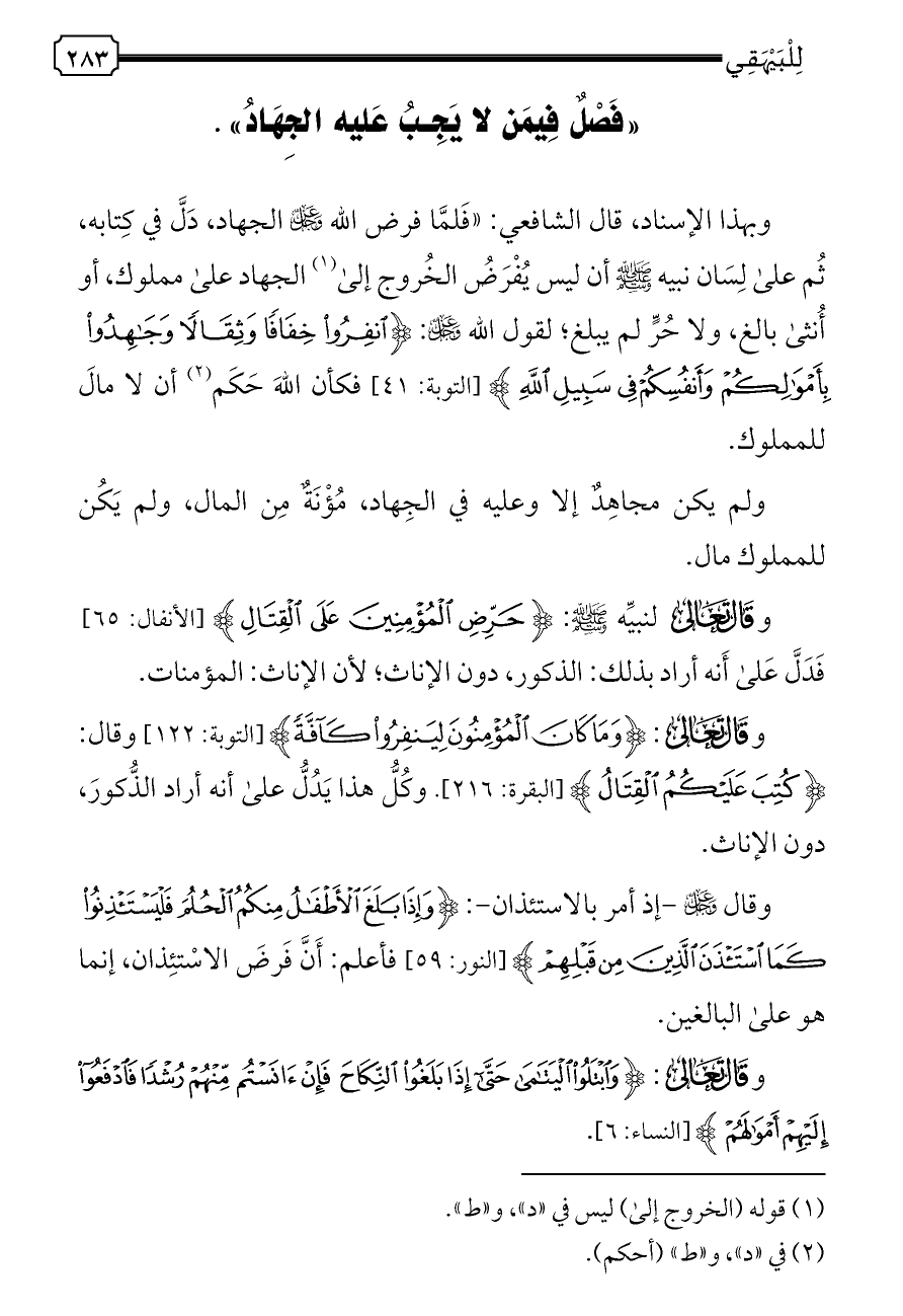 وبهذا الإسناد، قال الشافعي: «فَلمَّا فرض الله - عز وجل - الجهاد، دَلَّ في كِتابه، ثُم على لِسَان نبيه - صلى الله عليه وسلم - أن ليس يُفْرَضُ الخُروج إلى (¬١) الجهاد على مملوك، أو أُنثى بالغ، ولا حُرٍّ لم يبلغ؛ لقول الله - عز وجل -: {انْفِرُوا خِفَافًا وَثِقَالًا وَجَاهِدُوا بِأَمْوَالِكُمْ وَأَنْفُسِكُمْ فِي سَبِيلِ اللَّهِ} [التوبة: ٤١] فكأن اللهَ حَكَم (¬٢) أن لا مالَ للمملوك.