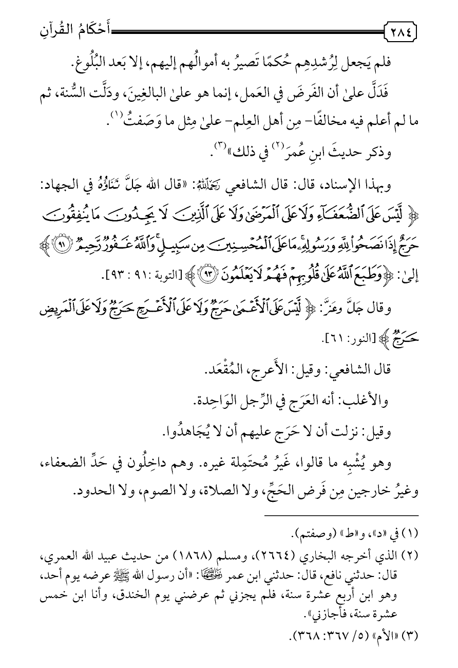 وبهذا الإسناد، قال: قال الشافعي - رحمه الله -: «قال الله جَلَّ ثَنَاؤُهُ في الجهاد: {لَيْسَ عَلَى الضُّعَفَاءِ وَلَا عَلَى الْمَرْضَى وَلَا عَلَى الَّذِينَ لَا يَجِدُونَ مَا يُنْفِقُونَ حَرَجٌ إِذَا نَصَحُوا لِلَّهِ وَرَسُولِهِ مَا عَلَى الْمُحْسِنِينَ مِنْ سَبِيلٍ وَاللَّهُ غَفُورٌ رَحِيمٌ (٩١)} إلى: {وَطَبَعَ اللَّهُ عَلَى قُلُوبِهِمْ فَهُمْ لَا يَعْلَمُونَ (٩٣)} [التوبة: ٩١: ٩٣].
