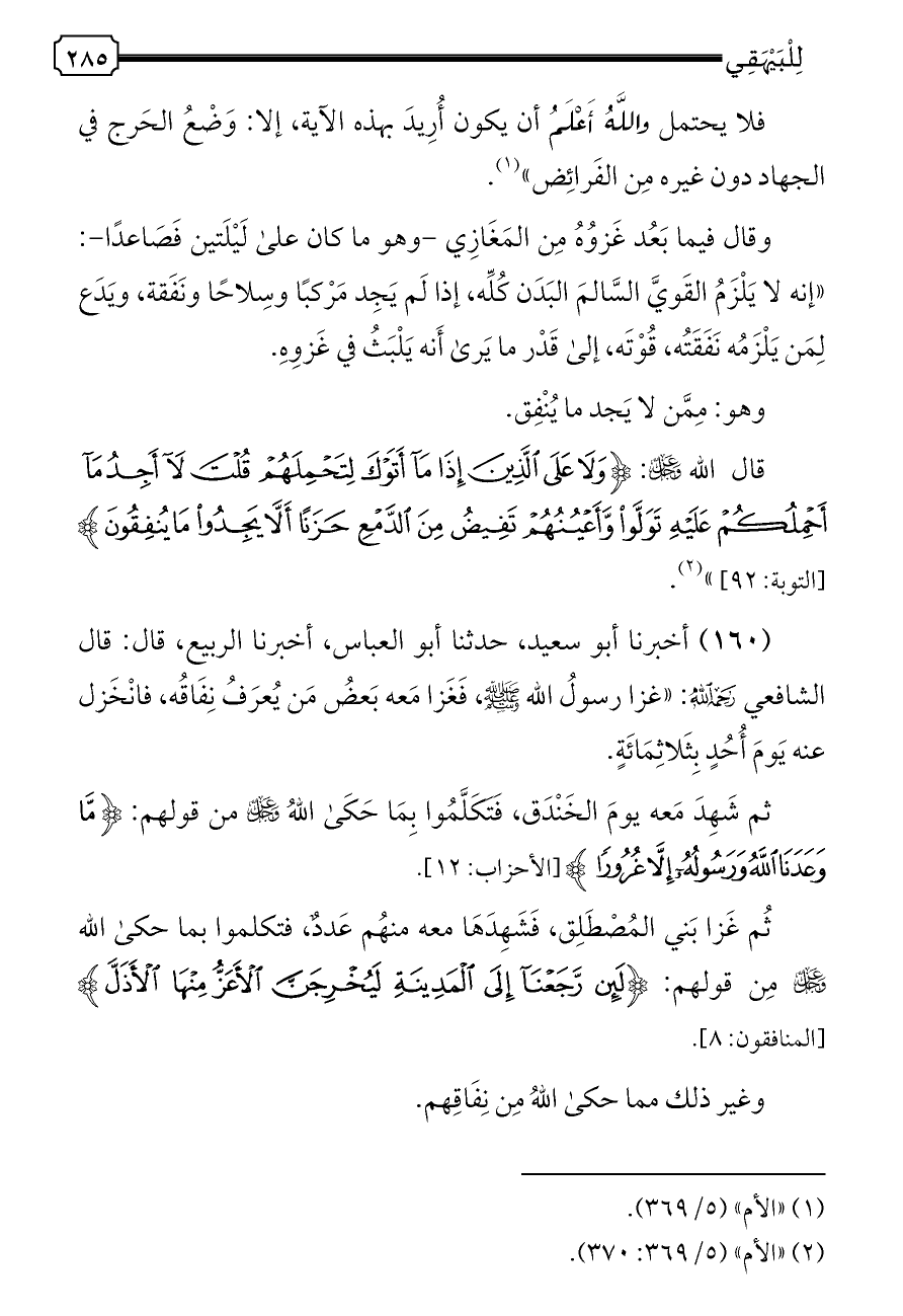 (١٦٠) أخبرنا أبو سعيد، حدثنا أبو العباس، أخبرنا الربيع، قال: قال الشافعي - رحمه الله -: «غزا رسولُ الله - صلى الله عليه وسلم -، فَغَزا مَعه بَعضُ مَن يُعرَفُ نِفَاقُه، فانْخَزل عنه يَومَ أُحُدٍ بِثَلاثِمَائَةٍ.
