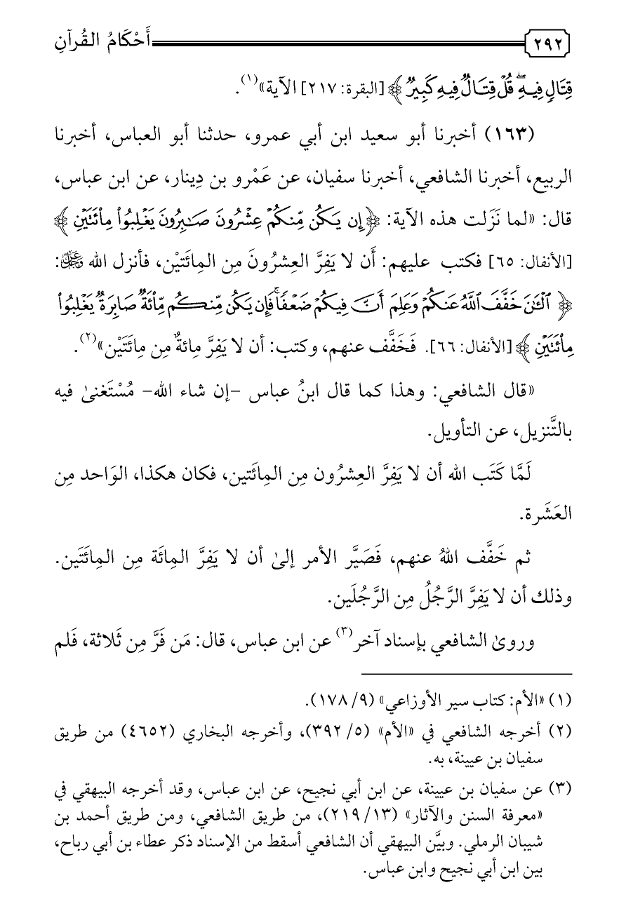 (١٦٣) أخبرنا أبو سعيد ابن أبي عمرو، حدثنا أبو العباس، أخبرنا الربيع، أخبرنا الشافعي، أخبرنا سفيان، عن عَمْرو بن دِينار، عن ابن عباس، قال: «لما نَزَلت هذه الآية: {إِنْ يَكُنْ مِنْكُمْ عِشْرُونَ صَابِرُونَ يَغْلِبُوا مِائَتَيْنِ} [الأنفال: ٦٥] فكتب عليهم: أَن لا يَفِرَّ العِشرُونَ مِن المِائَتيْن، فأنزل الله - عز وجل -: {الْآنَ خَفَّفَ اللَّهُ عَنْكُمْ وَعَلِمَ أَنَّ فِيكُمْ ضَعْفًا فَإِنْ يَكُنْ مِنْكُمْ مِائَةٌ صَابِرَةٌ يَغْلِبُوا مِائَتَيْنِ} [الأنفال: ٦٦]. فَخَفَّف عنهم، وكتب: أن لا يَفِرَّ مِائةٌ مِن مِائَتَيْن» (¬٢).