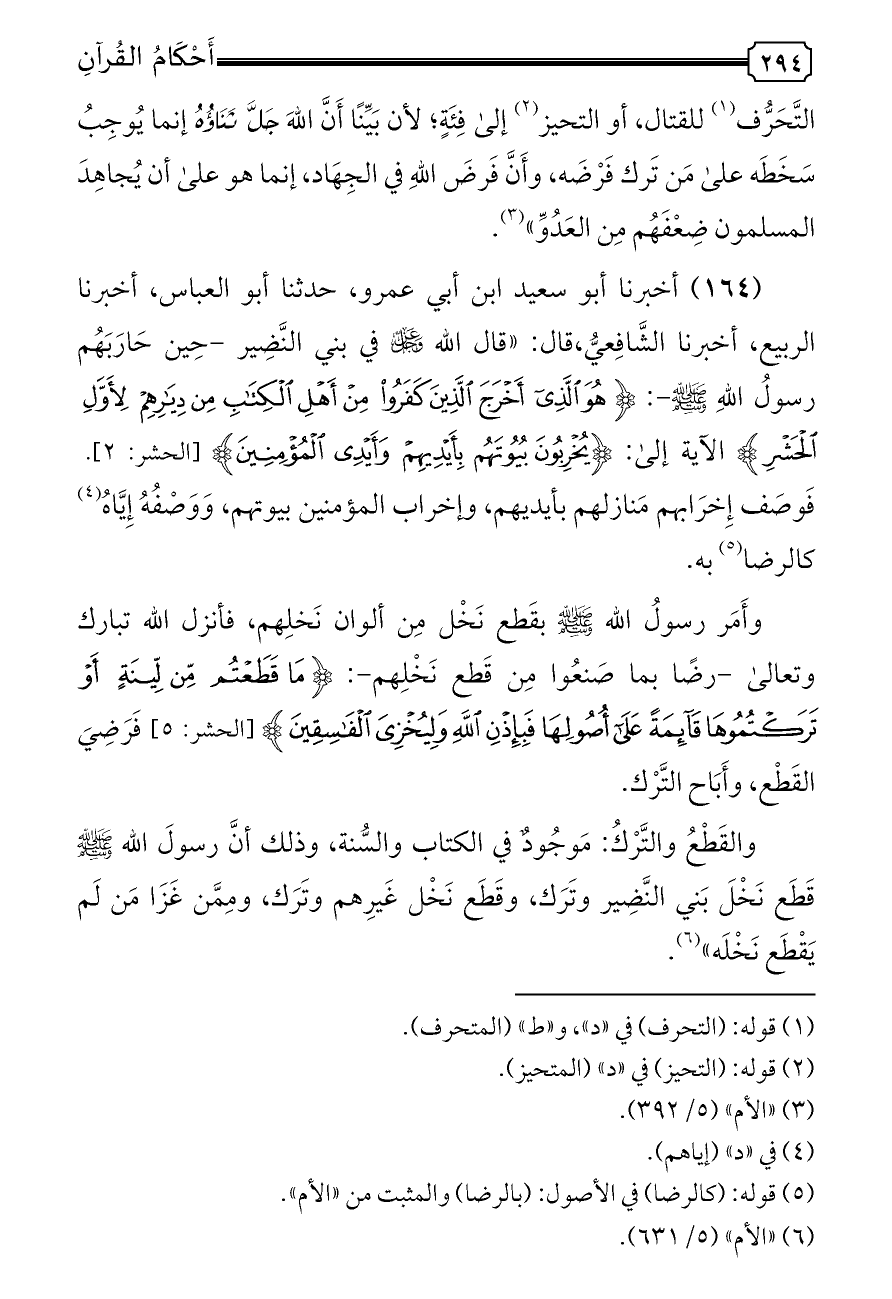 (١٦٤) أخبرنا أبو سعيد ابن أبي عمرو، حدثنا أبو العباس، أخبرنا الربيع، أخبرنا الشَّافِعيُّ، قال: «قال الله - عز وجل - في بني النَّضِير -حِين حَارَبَهُم رسولُ اللهِ - صلى الله عليه وسلم -: {هُوَ الَّذِي أَخْرَجَ الَّذِينَ كَفَرُوا مِنْ أَهْلِ الْكِتَابِ مِنْ دِيَارِهِمْ لِأَوَّلِ الْحَشْرِ} الآية إلى: {يُخْرِبُونَ بُيُوتَهُمْ بِأَيْدِيهِمْ وَأَيْدِي الْمُؤْمِنِينَ} [الحشر: ٢]. فَوصَف إِخرَابهم مَنازلهم بأيديهم، وإخراب المؤمنين بيوتهم، وَوَصْفُهُ إِيَّاهُ (¬٤) كالرضا (¬٥) به.