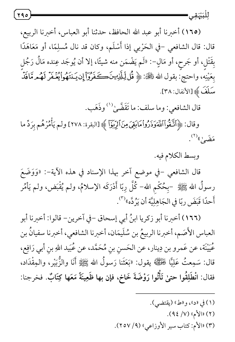 (١٦٥) أخبرنا أبو عبد الله الحافظ، حدثنا أبو العباس، أخبرنا الربيع، قال: قال الشافعي -في الحَرْبي إذا أَسْلَم، وكان قد نال مُسلِمًا، أو مَعَاهَدًا بِقَتْلٍ، أو جَرحٍ، أو مَالٍ-: «لَم يَضْمَن منه شيئًا، إلا أن يُوجَد عِنده مَالُ رَجُلٍ بِعَيْنِه، واحتج: بقول الله - عز وجل -: {قُلْ لِلَّذِينَ كَفَرُوا إِنْ يَنْتَهُوا يُغْفَرْ لَهُمْ مَا قَدْ سَلَفَ} [الأنفال: ٣٨].