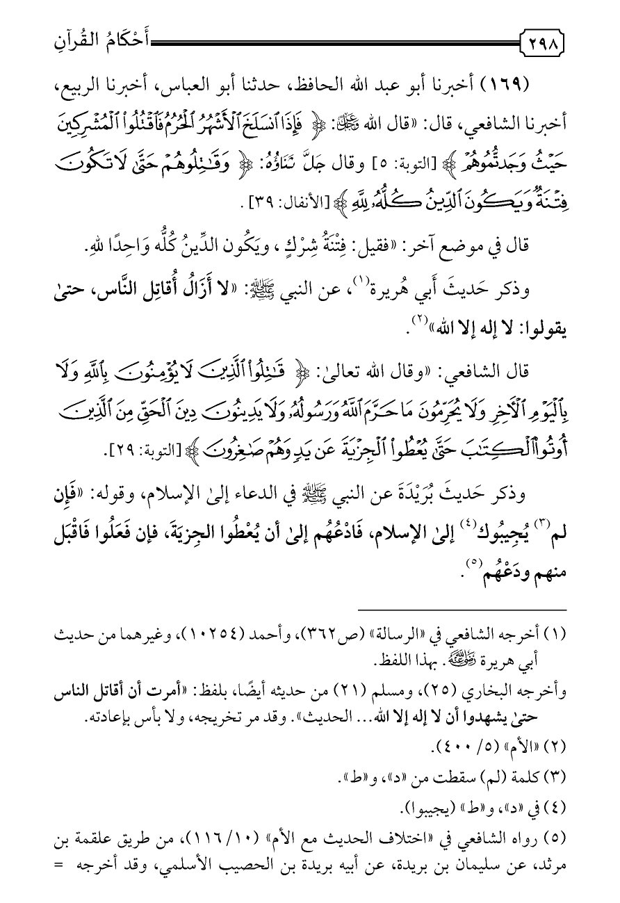 (١٦٩) أخبرنا أبو عبد الله الحافظ، حدثنا أبو العباس، أخبرنا الربيع، أخبرنا الشافعي، قال: «قال الله - عز وجل -: {فَإِذَا انْسَلَخَ الْأَشْهُرُ الْحُرُمُ فَاقْتُلُوا الْمُشْرِكِينَ حَيْثُ وَجَدْتُمُوهُمْ} [التوبة: ٥] وقال جَلَّ ثَنَاؤُهُ: {وَقَاتِلُوهُمْ حَتَّى لَا تَكُونَ فِتْنَةٌ وَيَكُونَ الدِّينُ كُلُّهُ لِلَّهِ} [الأنفال: ٣٩].