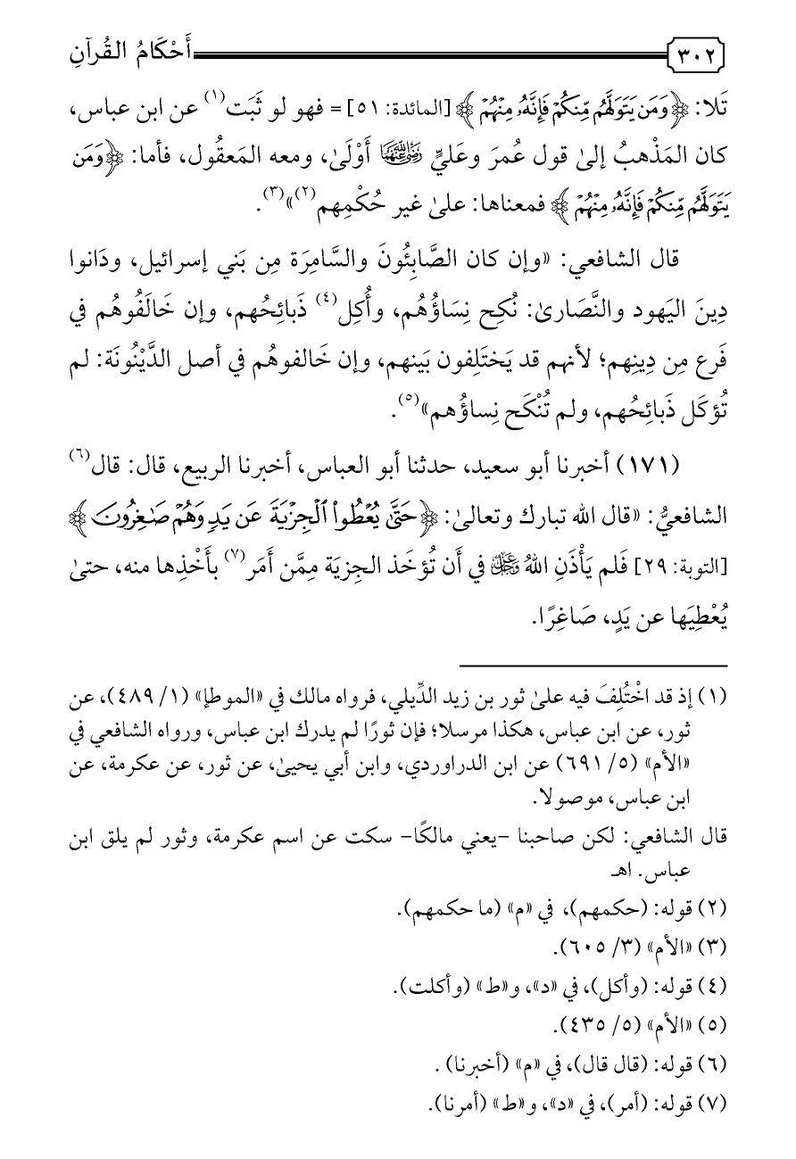 قال الشافعي: «وإن كان الصَّابِئُونَ والسَّامِرَة مِن بَني إسرائيل، ودَانوا دِينَ اليَهود والنَّصَارى: نُكِح نِسَاؤُهُم، وأُكِل (¬٤) ذَبائِحُهم، وإن خَالَفُوهُم في فَرع مِن دِينِهم؛ لأنهم قد يَختَلِفون بَينهم، وإن خَالفوهُم في أصل الدَّيْنُونَة: لم تُؤكَل ذَبائِحُهم، ولم تُنْكَح نِساؤُهم» (¬٥).