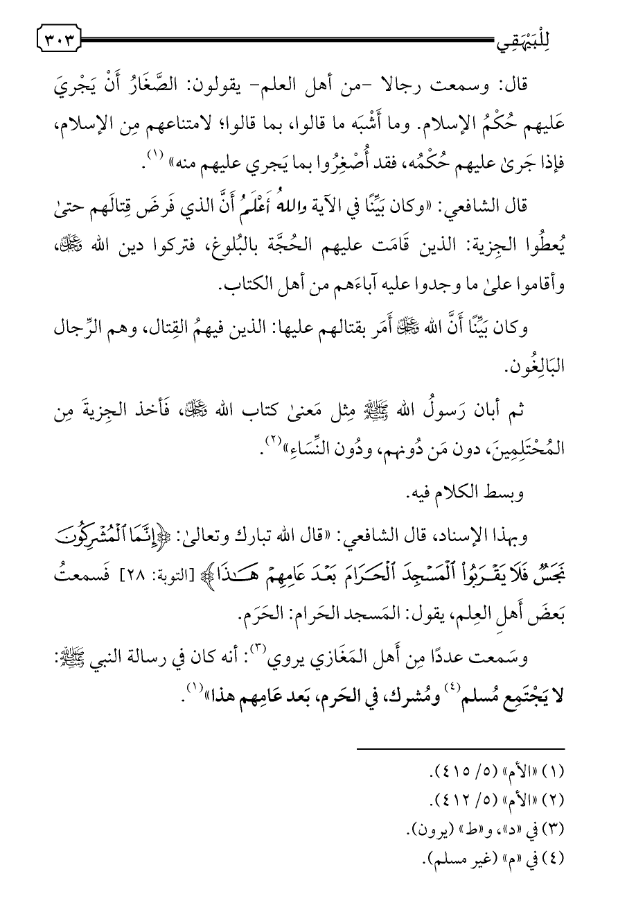 (¬٥) «الأم» (٥/ ٤١٩)، والحديث أخرجه الترمذي (٨٧١)، وغيره، من حديث زيد بن أثيع قال: «سألت عليًّا بأي شيء بعثت؟ قال: بأربع: لا يدخل الجنة إلا نَفس مُسلمة، ولا يطوف بالبيت عريان، ولا يجتمع المسلمون والمشركون بعد عامهم هذا ... » الحديث.