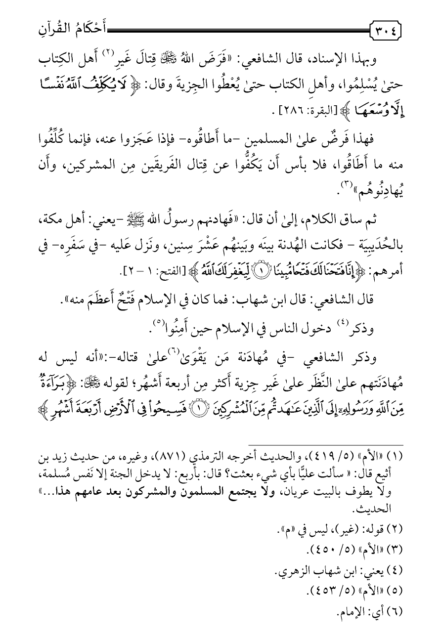 وبهذا الإسناد، قال الشافعي: «فَرَضَ اللهُ - عز وجل - قِتالَ غَيرِ (¬١) أَهل الكِتاب حتى يُسْلِمُوا، وأهلِ الكتاب حتى يُعْطُوا الجِزيةَ وقال: {لَا يُكَلِّفُ اللَّهُ نَفْسًا إِلَّا وُسْعَهَا} [البقرة: ٢٨٦].