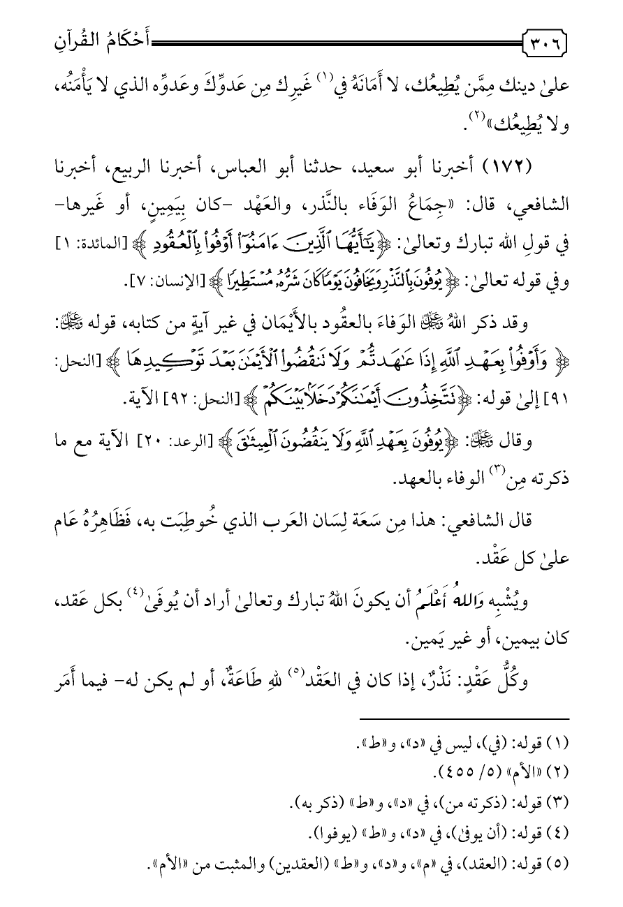 (١٧٢) أخبرنا أبو سعيد، حدثنا أبو العباس، أخبرنا الربيع، أخبرنا الشافعي، قال: «جِمَاعُ الوَفَاء بالنَّذر، والعَهْد -كان بِيَمِينٍ، أو غَيرها-