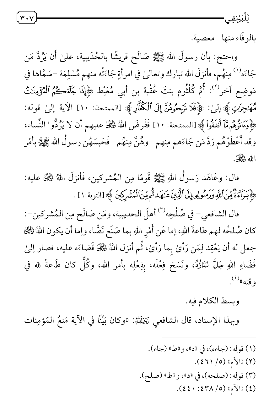 واحتج: بأن رسولَ الله - صلى الله عليه وسلم - صَالَح قريشًا بالحُدَيبية، على أَن يَرُدَّ مَن جَاءَه (¬١) مِنهُم، فأنزلَ الله تبارك وتعالى في امرأةٍ جَاءَتْه منهم مُسْلِمَة -سَمَّاها في مَوضِع آخر (¬٢): أُمَّ كُلْثُوم بنتَ عُقْبة بن أبي مُعَيْط {إِذَا جَاءَكُمُ الْمُؤْمِنَاتُ مُهَاجِرَاتٍ} إلى: {فَلَا تَرْجِعُوهُنَّ إِلَى الْكُفَّارِ} [الممتحنة: ١٠] الآية إلى قوله: {وَآتُوهُمْ مَا أَنْفَقُوا} [الممتحنة: ١٠] فَفَرضَ اللهُ - عز وجل - عليهم أن لا يَرُدُّوا النِّساء، وقد أَعْطَوْهُم رَدَّ مَن جَاءَهم مِنهم -وهُنَّ مِنهُم- فَحَبسَهُن رسولُ الله - صلى الله عليه وسلم - بأمْر الله - عز وجل -.