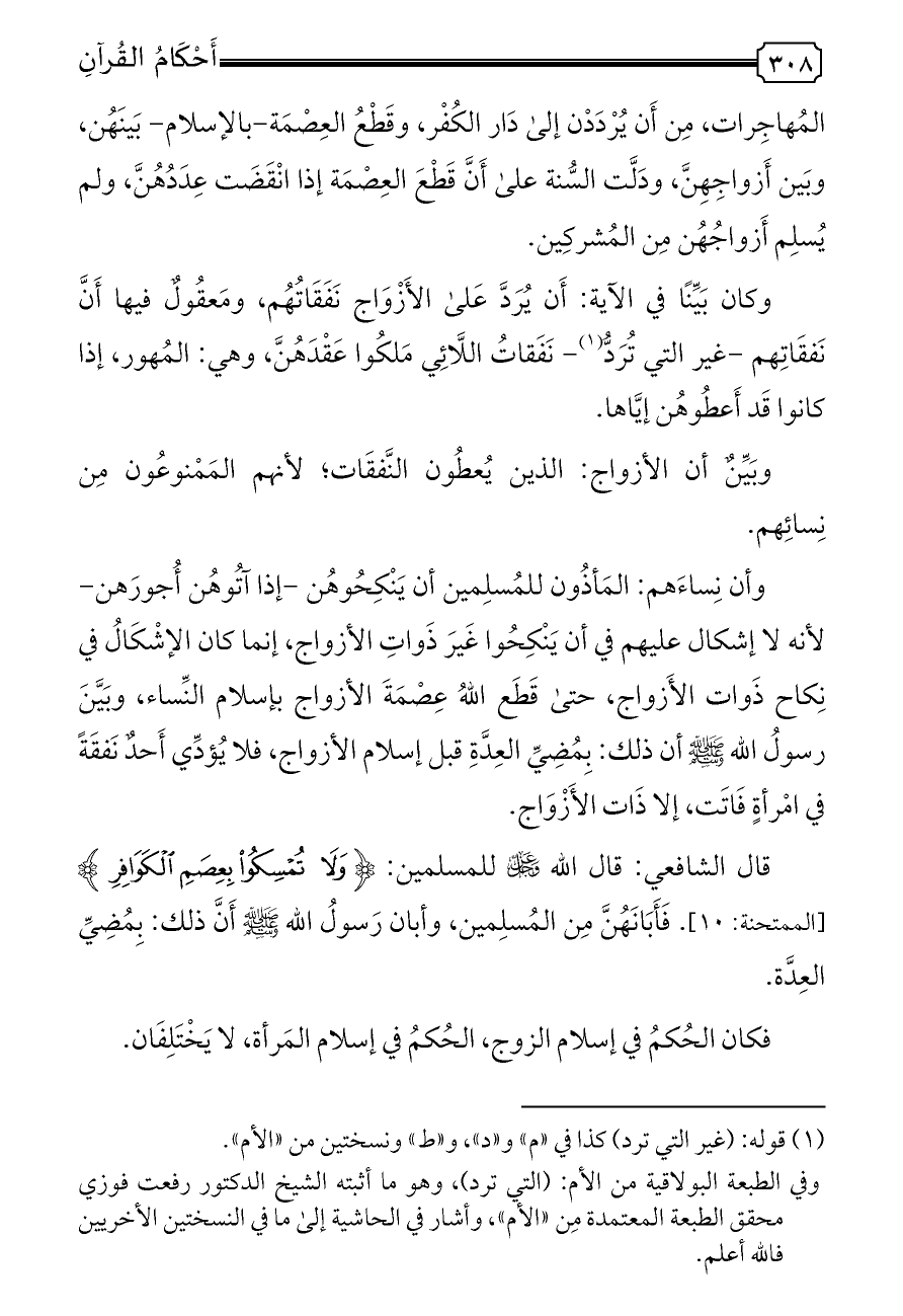 قال الشافعي: قال الله - عز وجل - للمسلمين: {وَلَا تُمْسِكُوا بِعِصَمِ الْكَوَافِرِ} [الممتحنة: ١٠]. فَأَبَانَهُنَّ مِن المُسلِمين، وأبان رَسولُ الله - صلى الله عليه وسلم - أَنَّ ذلك: بِمُضِيِّ العِدَّة.