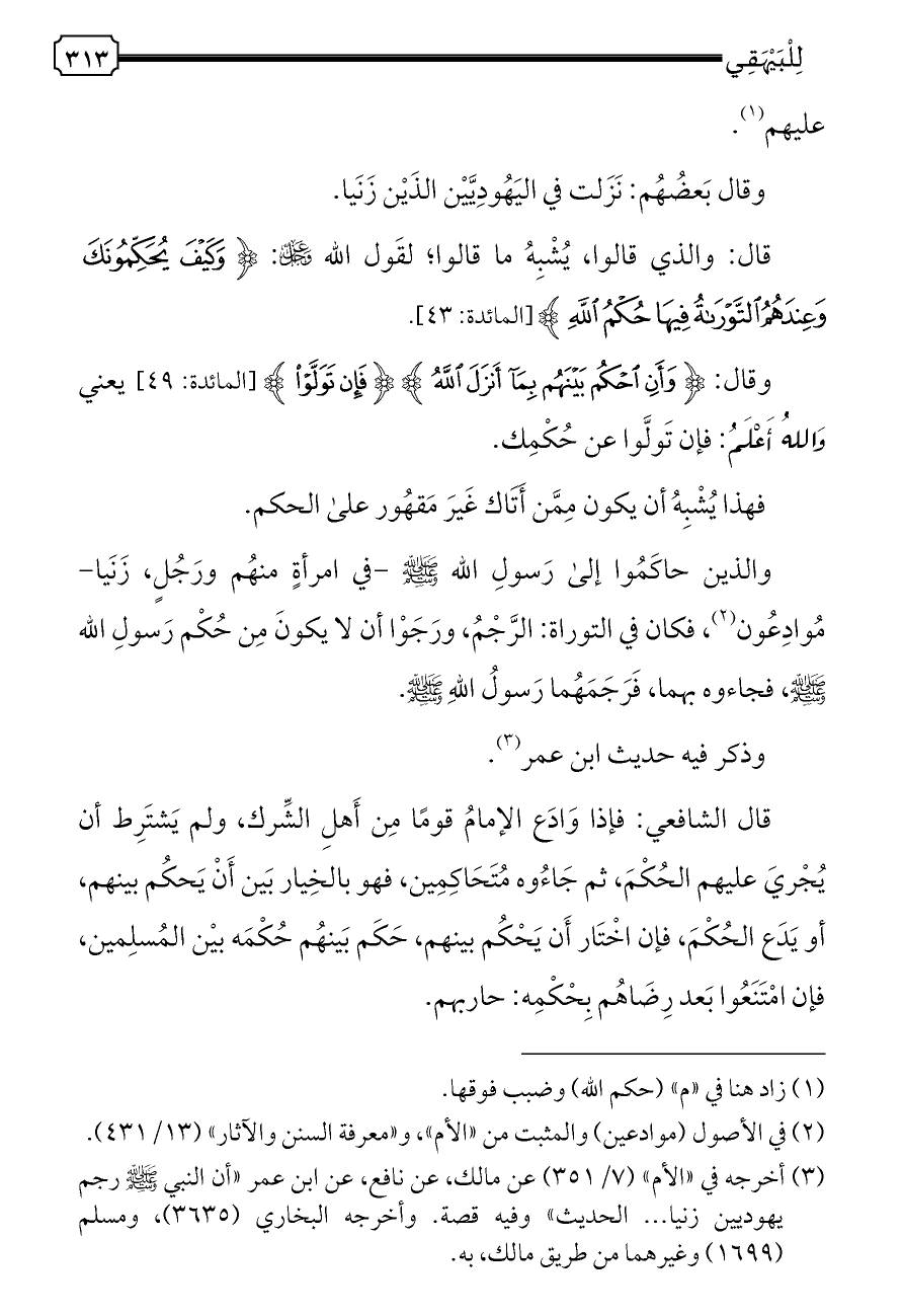 (¬٣) أخرجه في «الأم» (٧/ ٣٥١) عن مالك، عن نافع، عن ابن عمر «أن النبي - صلى الله عليه وسلم - رجم يهوديين زنيا ... الحديث» وفيه قصة. وأخرجه البخاري (٣٦٣٥)، ومسلم (١٦٩٩) وغيرهما من طريق مالك، به.