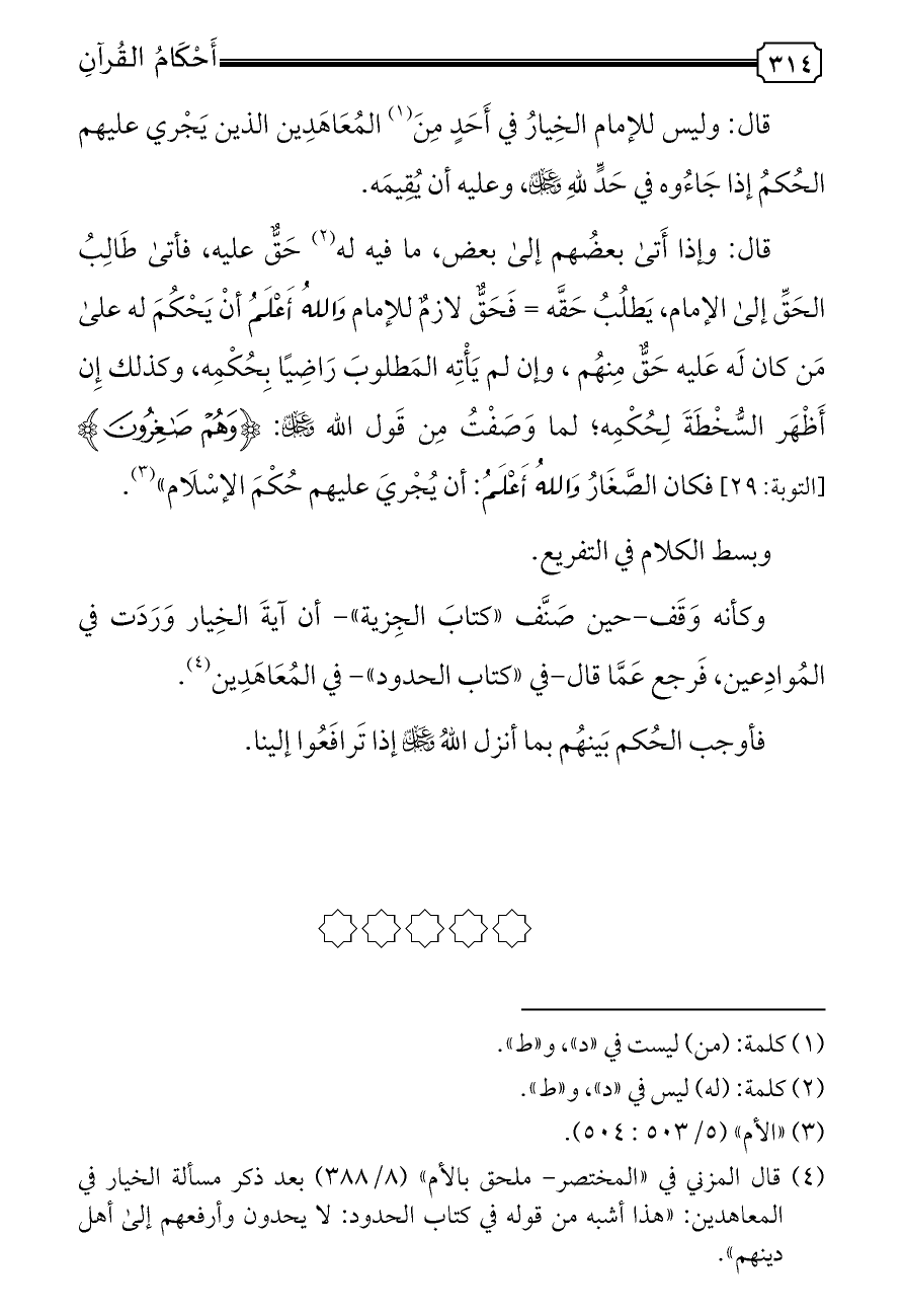 وكأنه وَقَف-حين صَنَّف «كتابَ الجِزية» - أن آيةَ الخِيار وَرَدَت في المُوادِعين، فَرجع عَمَّا قال-في «كتاب الحدود» - في المُعَاهَدِين (¬٤).