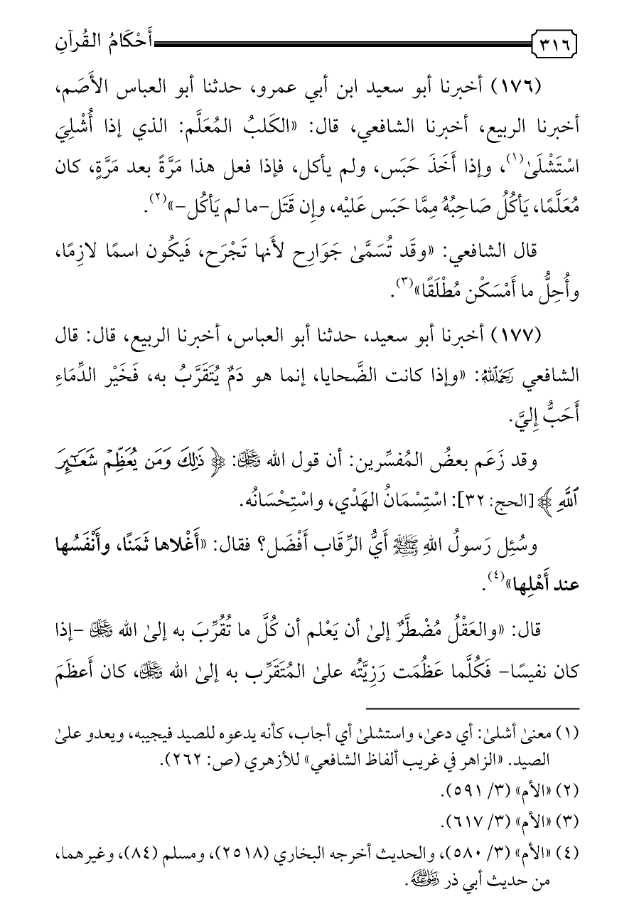 (١٧٧) أخبرنا أبو سعيد، حدثنا أبو العباس، أخبرنا الربيع، قال: قال الشافعي - رحمه الله -: «وإذا كانت الضَّحايا، إنما هو دَمٌ يُتَقَرَّبُ به، فَخَيْر الدِّمَاءِ أَحَبُّ إِليَّ.