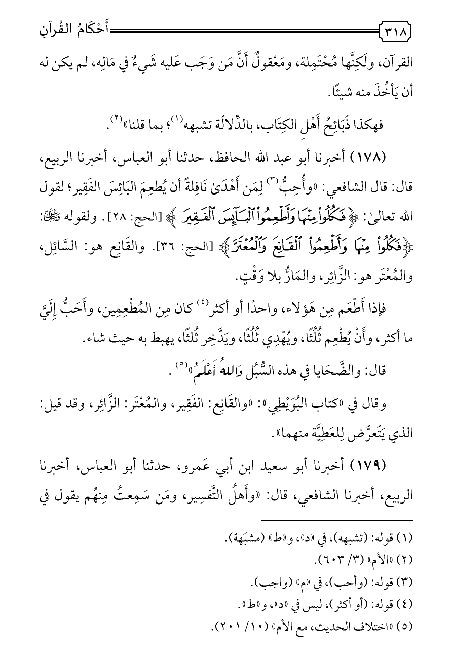 (١٧٨) أخبرنا أبو عبد الله الحافظ، حدثنا أبو العباس، أخبرنا الربيع، قال: قال الشافعي: «وأُحِبُّ (¬٣) لِمَن أَهْدَى نَافِلةً أن يُطعِمَ البَائِسَ الفَقِير؛ لقول الله تعالى: {فَكُلُوا مِنْهَا وَأَطْعِمُوا الْبَائِسَ الْفَقِيرَ} [الحج: ٢٨]. ولقوله - عز وجل -: {فَكُلُوا مِنْهَا وَأَطْعِمُوا الْقَانِعَ وَالْمُعْتَرَّ} [الحج: ٣٦]. والقَانِع هو: السَّائِل، والمُعْتَر هو: الزَّائِر، والمَارُّ بلا وَقْتٍ.