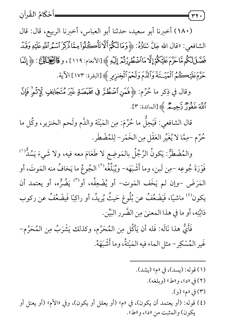 (١٨٠) أخبرنا أبو سعيد، حدثنا أبو العباس، أخبرنا الربيع، قال: قال الشافعي: «قال الله جَلَّ ثَنَاؤُهُ: {وَمَا لَكُمْ أَلَّا تَأْكُلُوا مِمَّا ذُكِرَ اسْمُ اللَّهِ عَلَيْهِ وَقَدْ فَصَّلَ لَكُمْ مَا حَرَّمَ عَلَيْكُمْ إِلَّا مَا اضْطُرِرْتُمْ إِلَيْهِ} [الأنعام: ١١٩]، وقال تعالى: {إِنَّمَا حَرَّمَ عَلَيْكُمُ الْمَيْتَةَ وَالدَّمَ وَلَحْمَ الْخِنْزِيرِ} [البقرة: ١٧٣] الآية.