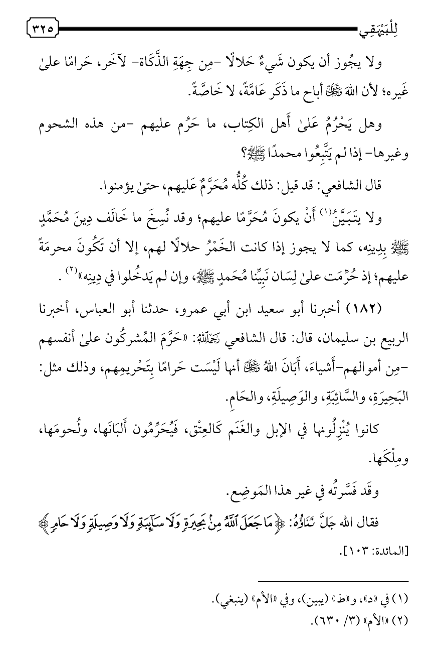 (١٨٢) أخبرنا أبو سعيد ابن أبي عمرو، حدثنا أبو العباس، أخبرنا الربيع بن سليمان، قال: قال الشافعي - رحمه الله -: «حَرَّمَ المُشركُون على أنفسهم -مِن أموالهم-أَشياءَ، أَبَانَ اللهُ - عز وجل - أنها لَيْسَت حَرامًا بِتَحْريمِهم، وذلك مثل: البَحِيرَةِ، والسَّائِبَةِ، والوَصِيلَةِ، والحَامِ.