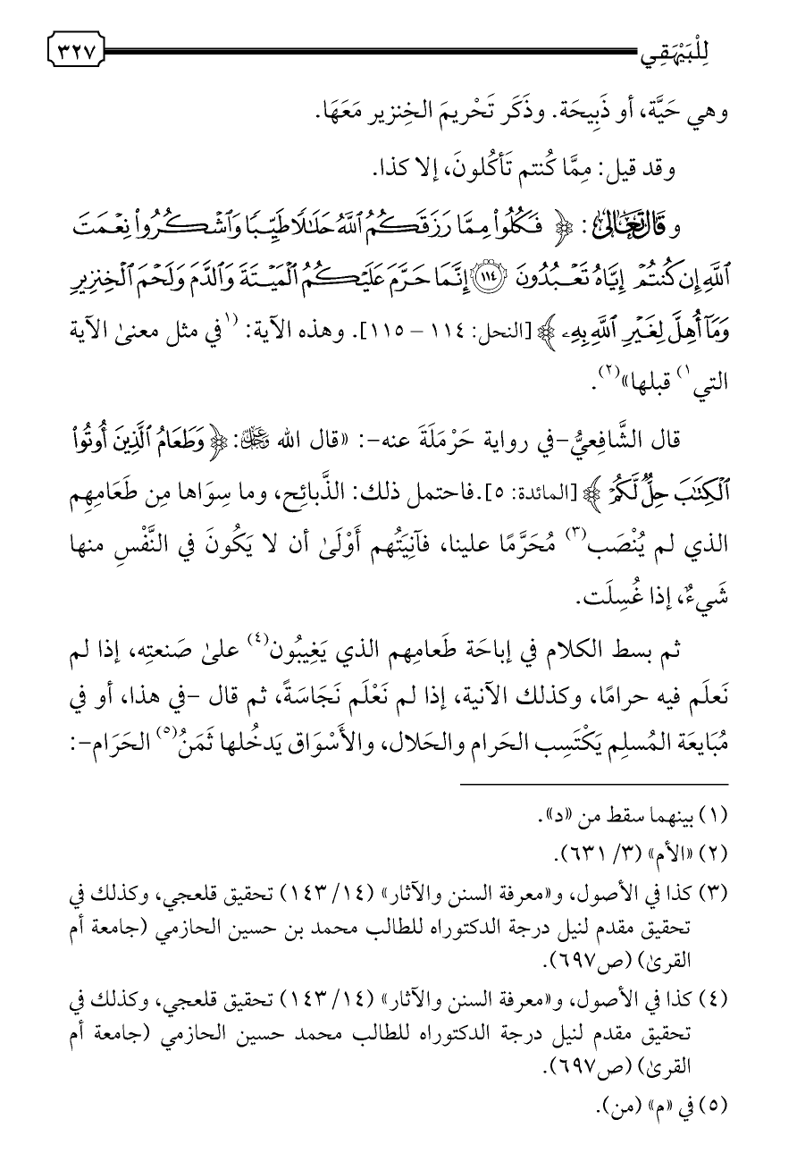 (¬٣) كذا في الأصول، و «معرفة السنن والآثار» (١٤/ ١٤٣) تحقيق قلعجي، وكذلك في تحقيق مقدم لنيل درجة الدكتوراه للطالب محمد بن حسين الحازمي (جامعة أم القرى) (ص ٦٩٧).